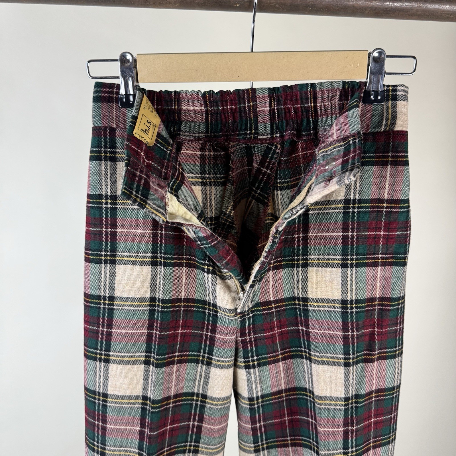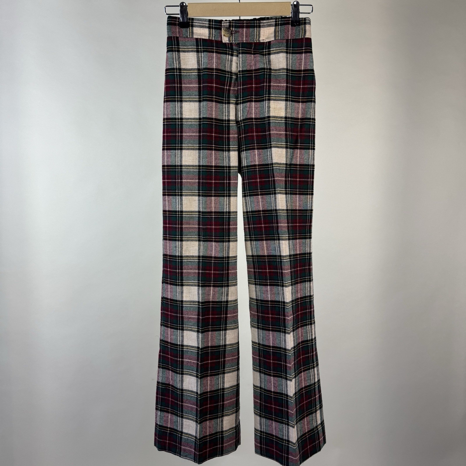 как выглядит 70s Vintage HIS Tartan Wool Bell Bottom Flare Pants 26 Elastic Waist Red Green фото