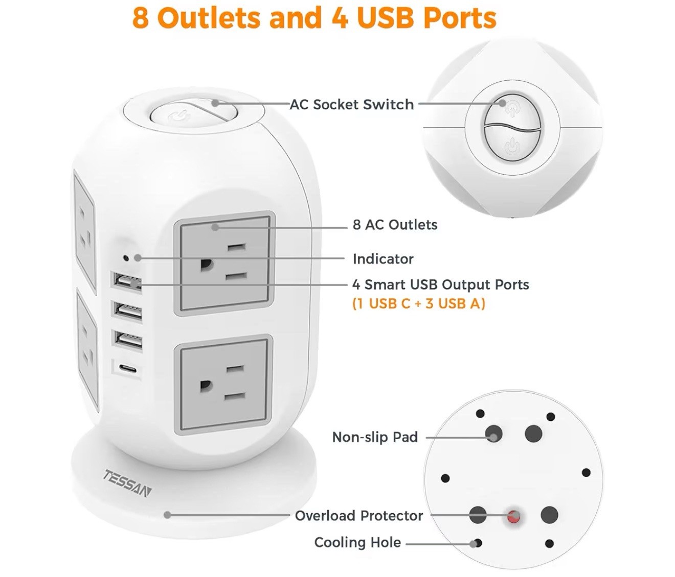 как выглядит TESSAN Tower Surge Protector Power Strip 10 ft, with Multiple Outlets, 8AC 4USB фото