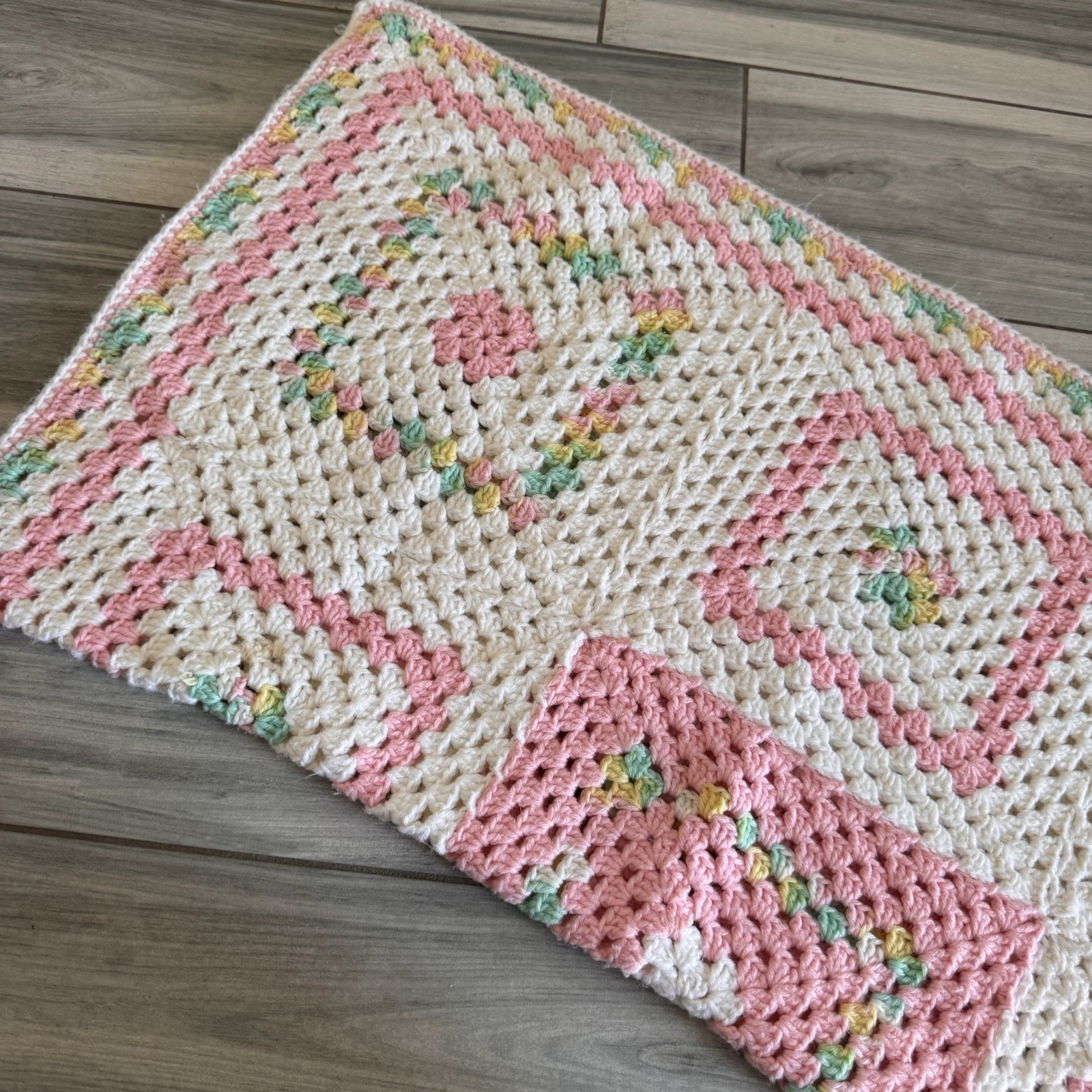 Girls Granny Square Crochet Afghan Handmade Baby Blanket Pink White 40x41