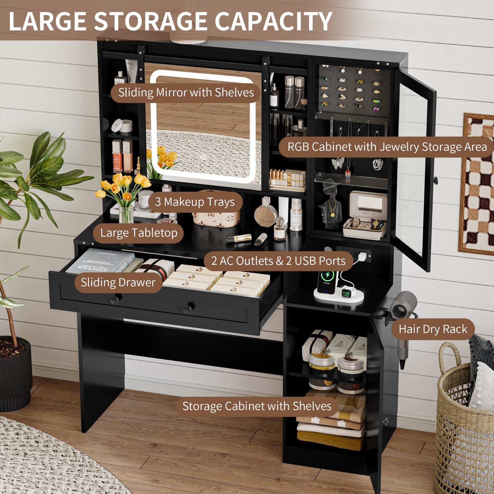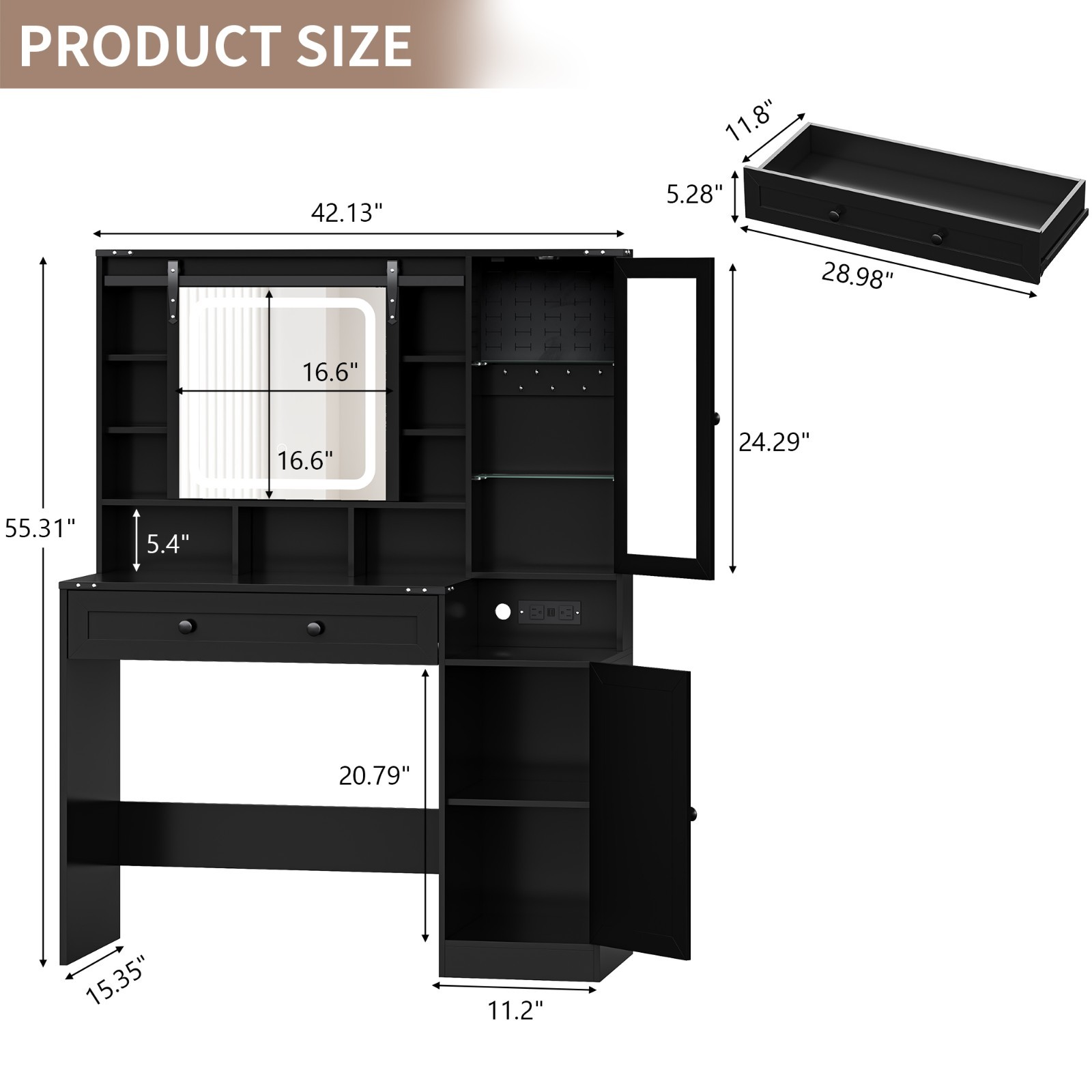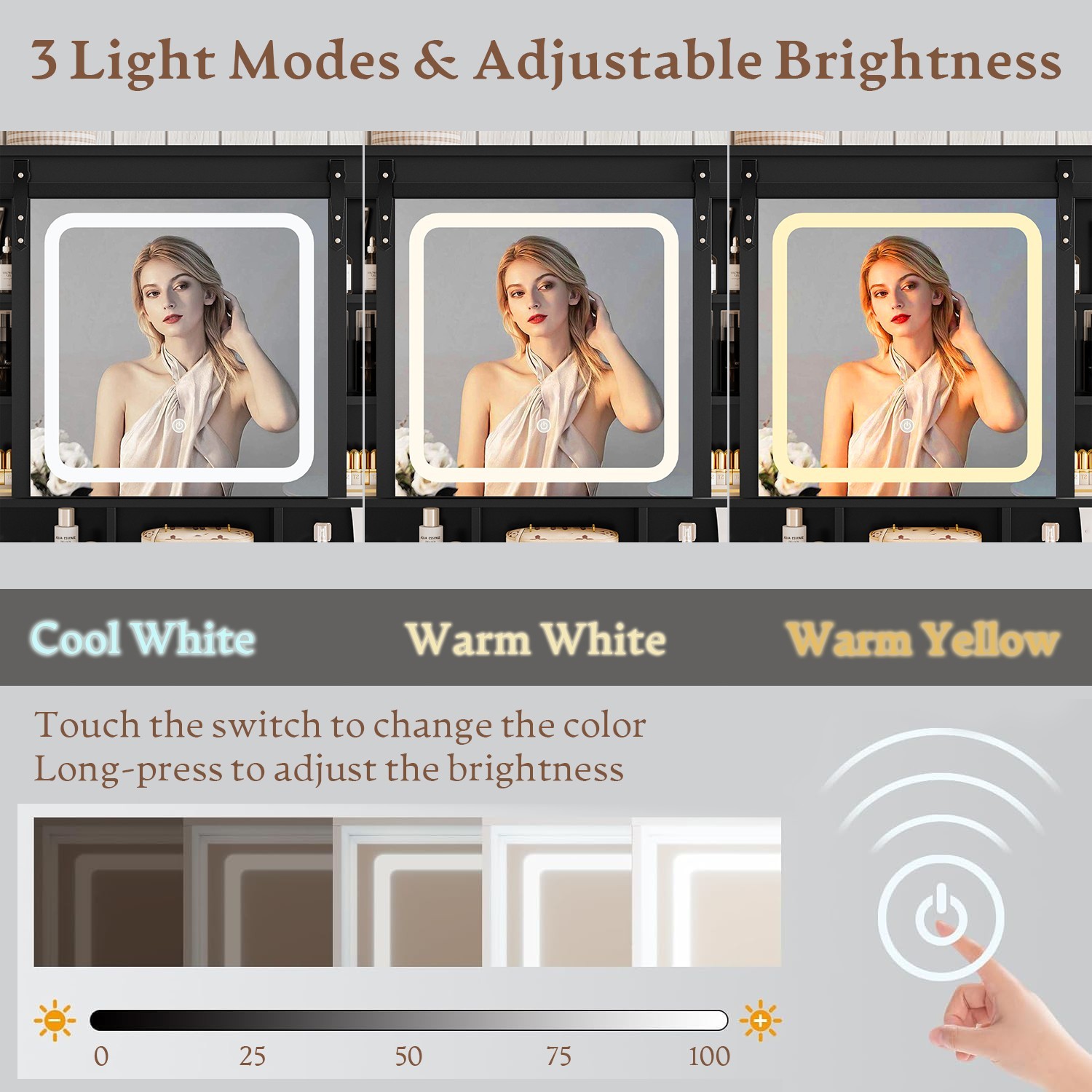 Vanity Desk with Mirror and Lights, Chair Glass Top, Fold-Up Panel for Room