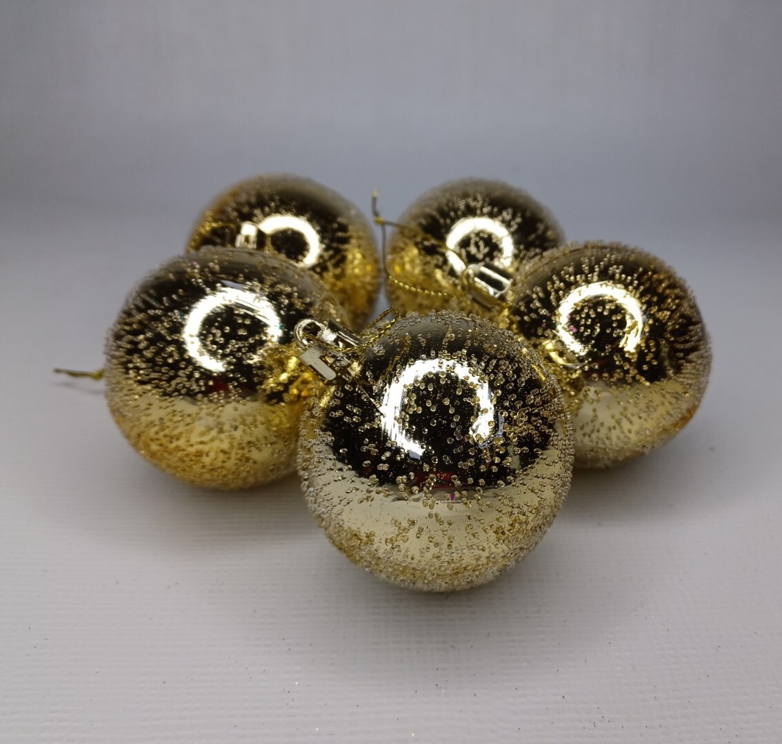 5 Christmas Tree Ornaments Shatterproof Plastic Gold Textured Balls