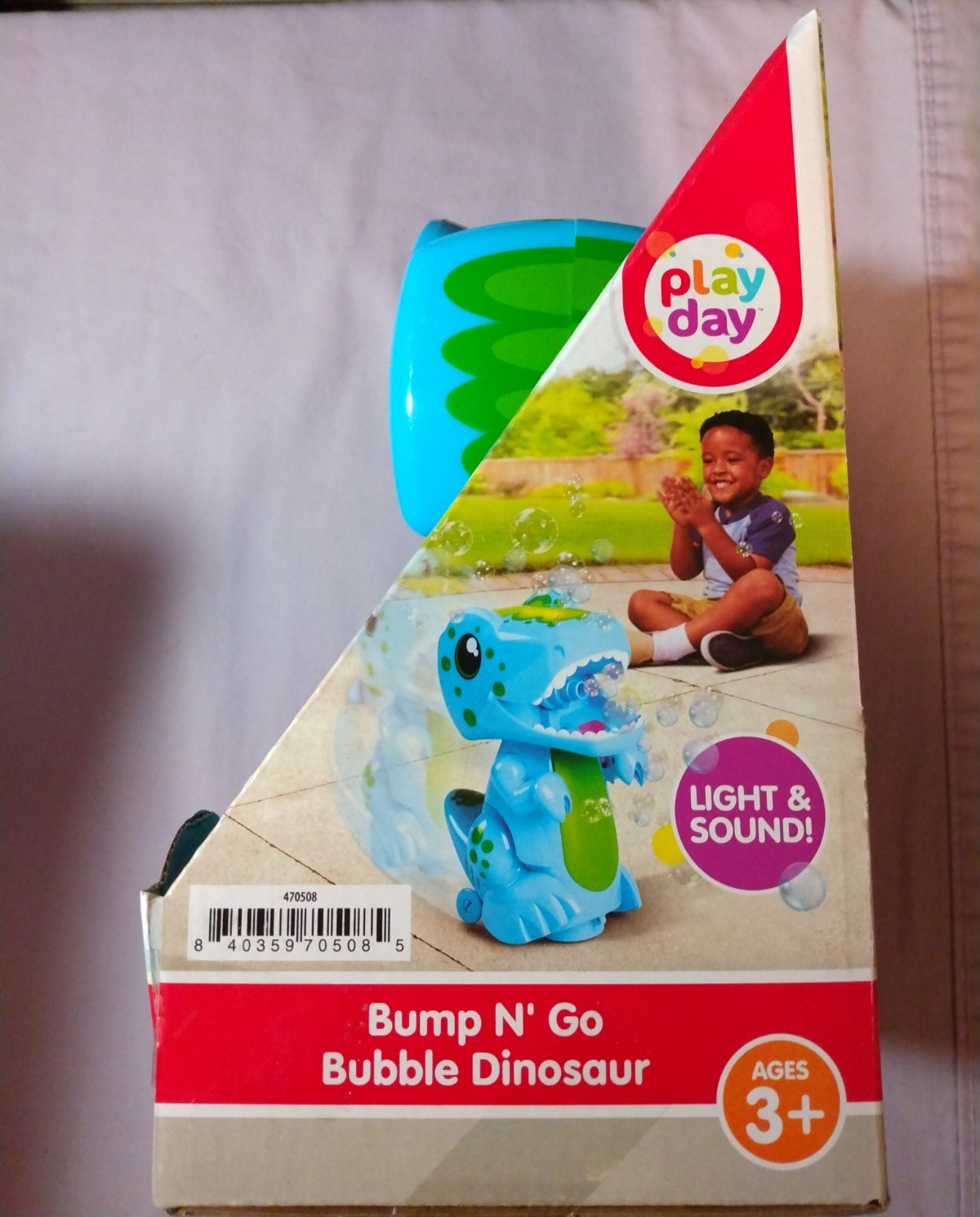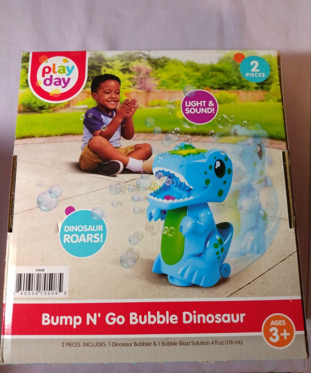 Play Day-Bump-N-Go Bubble Blowing Dino w/Lights,Sounds 4oz Solution Fast Ship