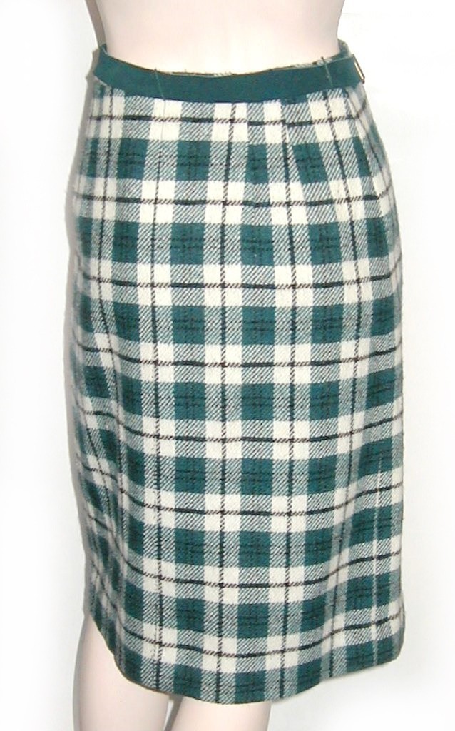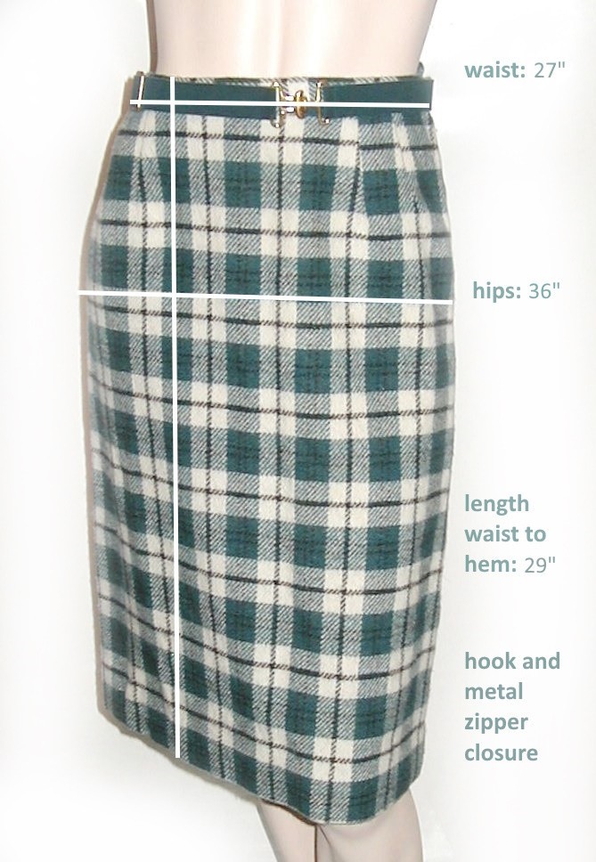 как выглядит 1960s Majestic PLAID WOOL PENCIL SKIRT Teal cream Lined Belt 27W Vintage Wiggle фото