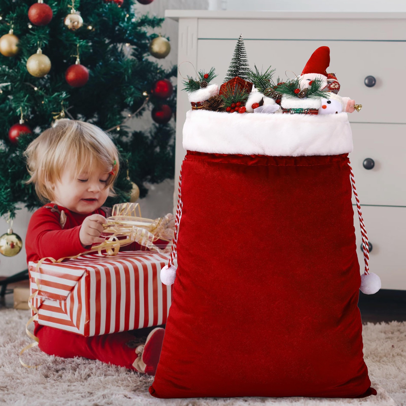 как выглядит 2 Pcs Christmas Velvet Bags With Drawstring - Large Plush Santa Sack in 2 Siz... фото