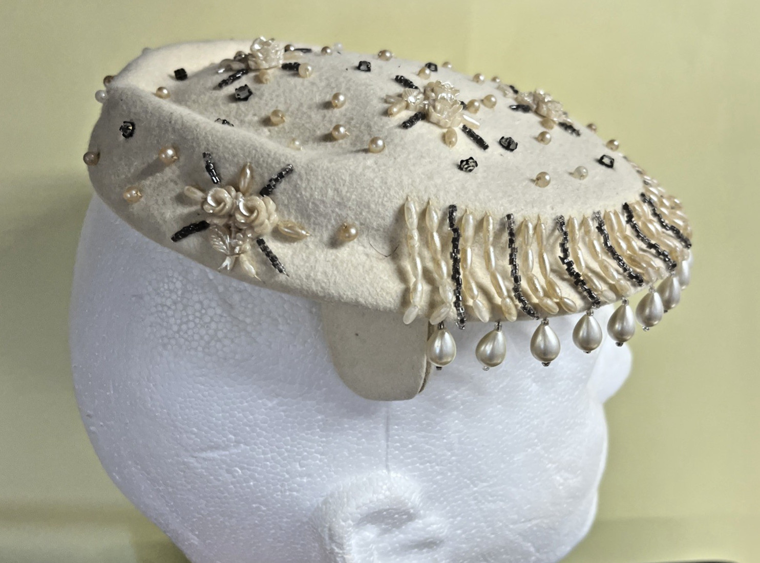 Womens Fancy Derby Wedding Hat White With Hanging Gold Pearls not real