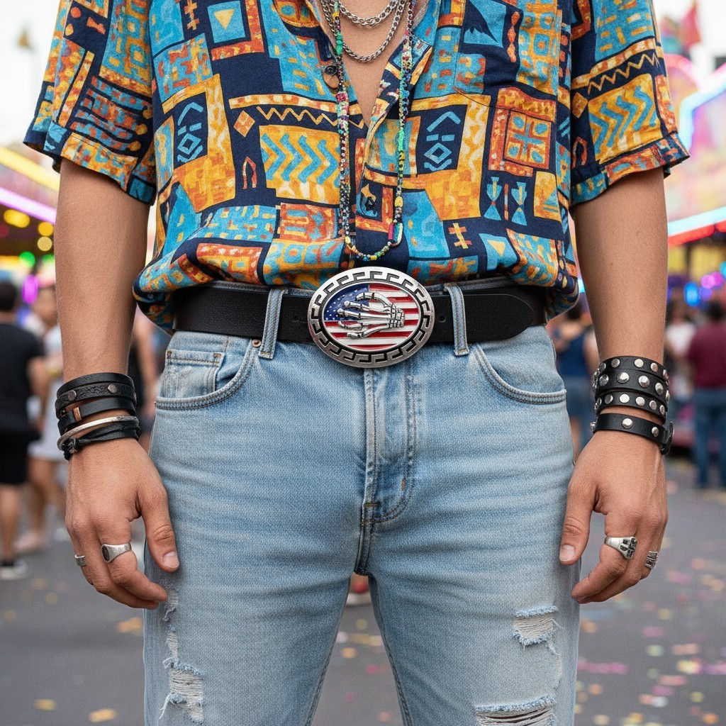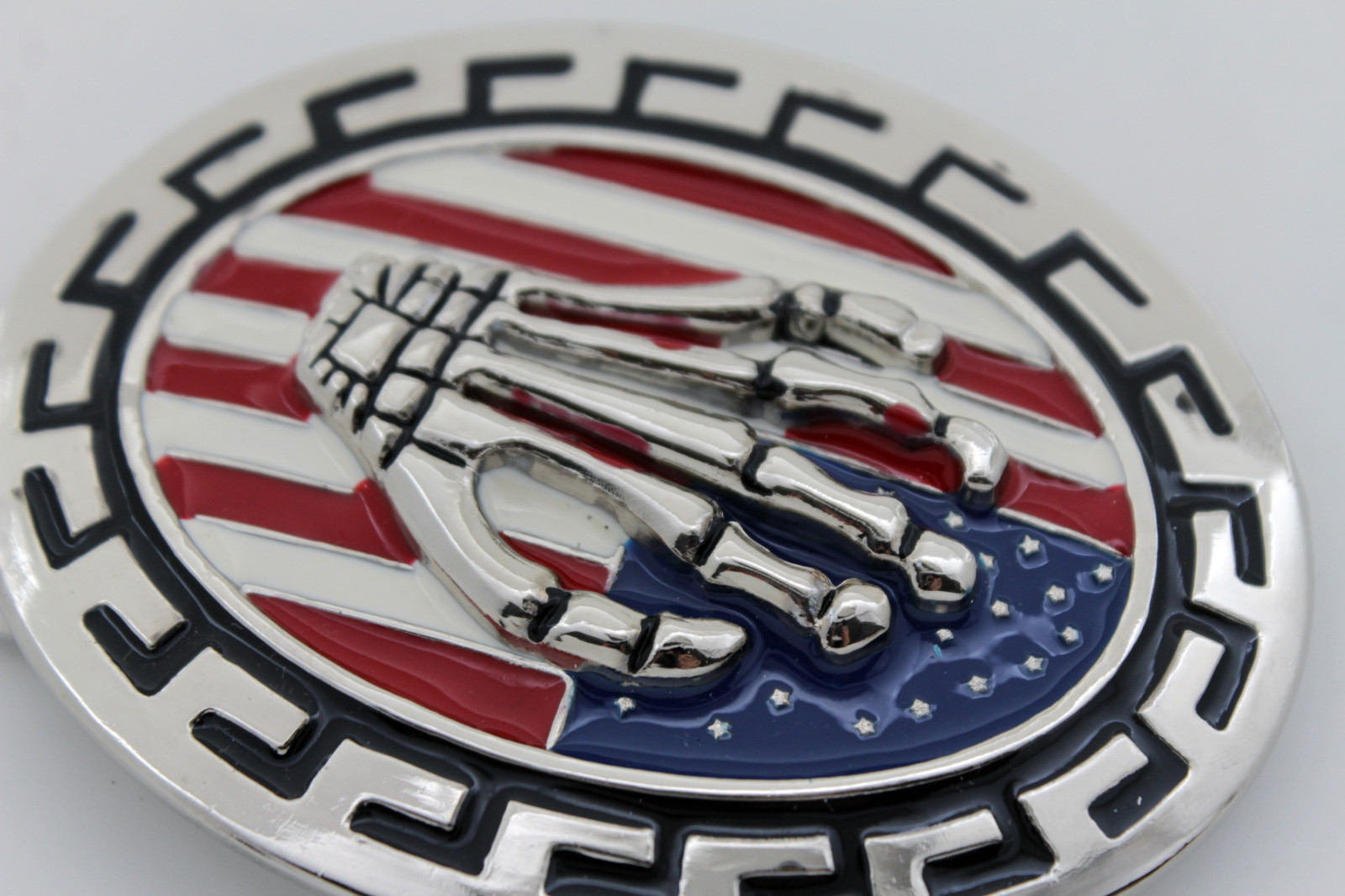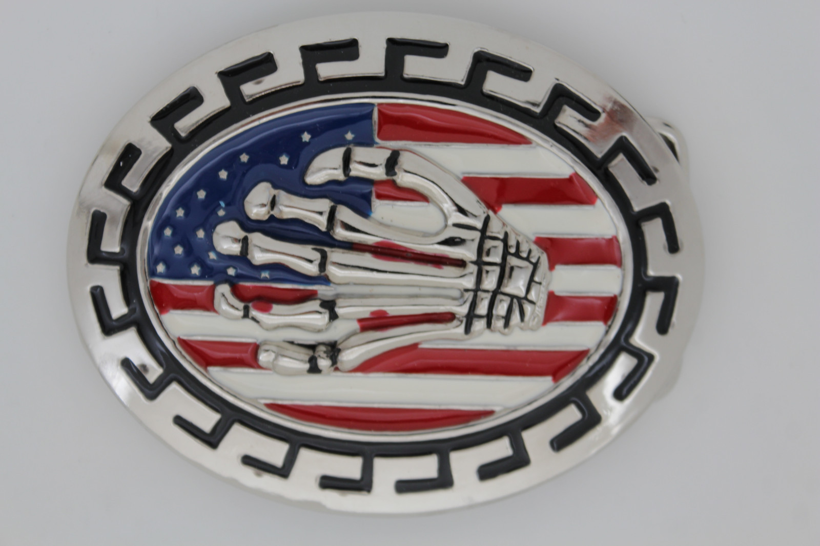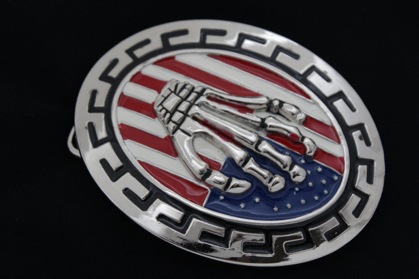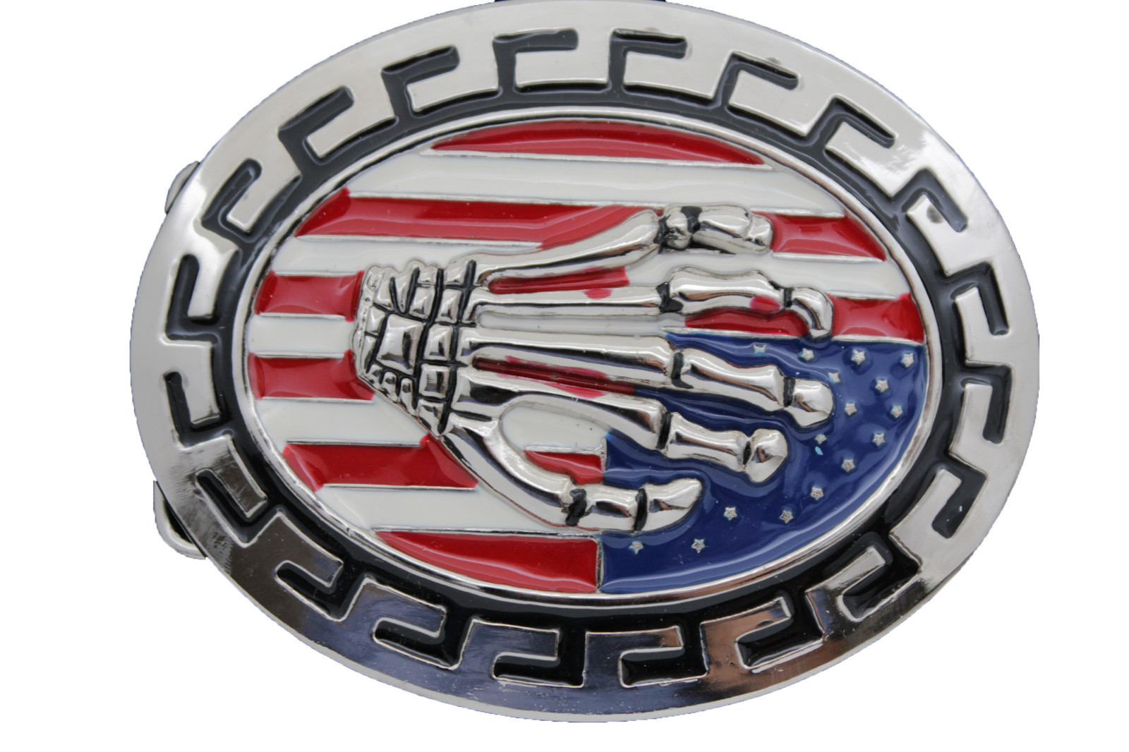 Men Silver Belt Buckle Skull Skeleton Hand USA Flag United States America Oval