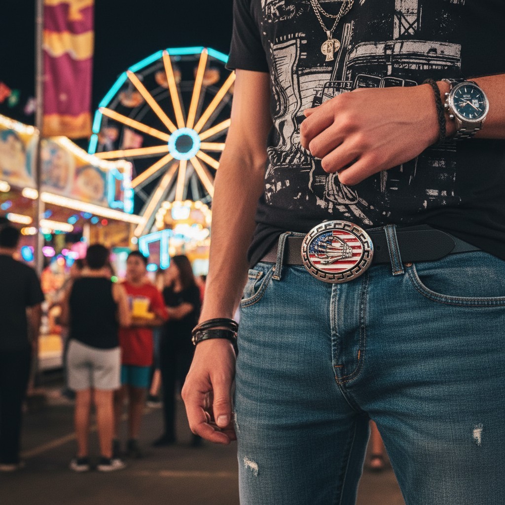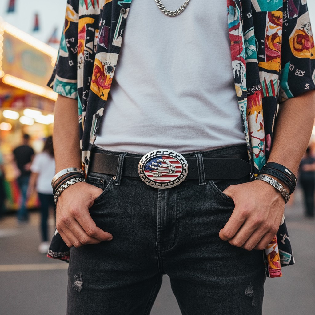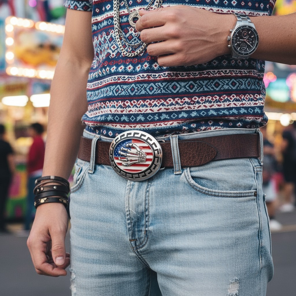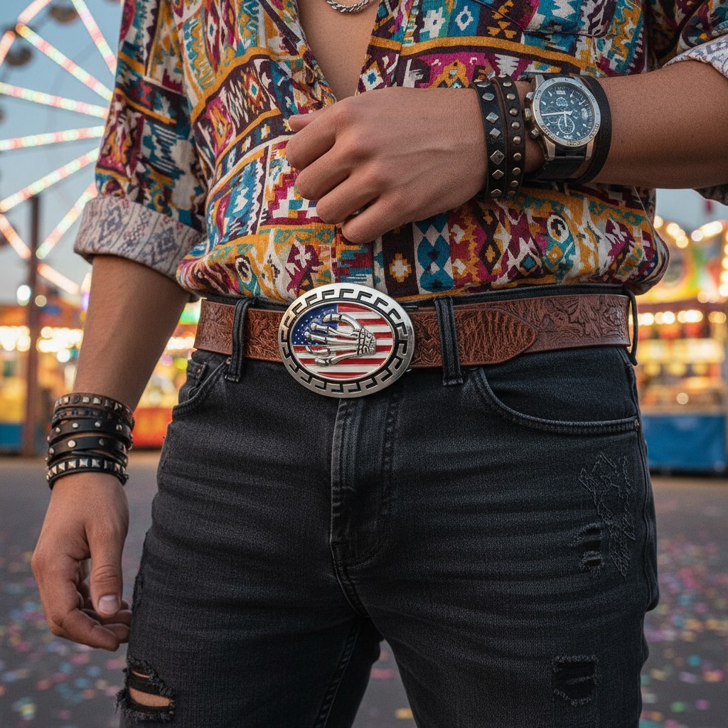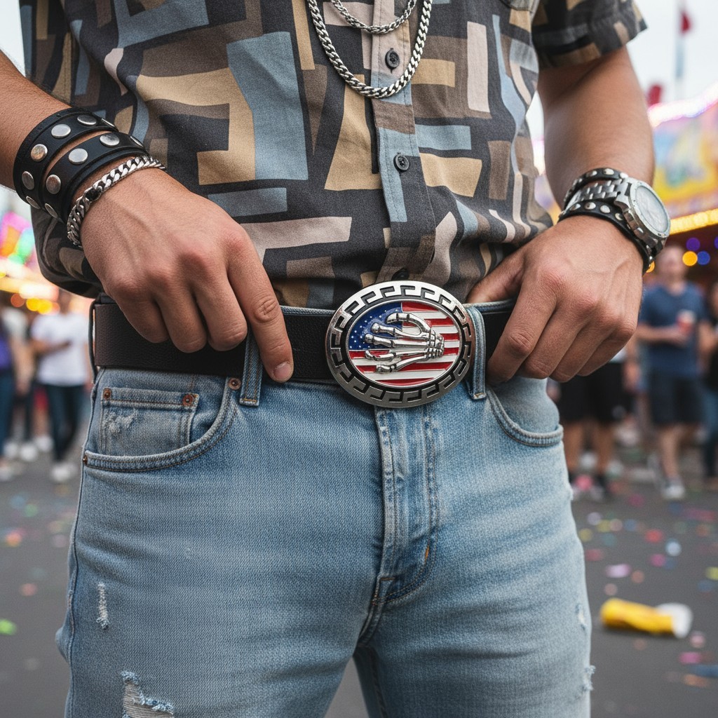 Men Silver Belt Buckle Skull Skeleton Hand USA Flag United States America Oval