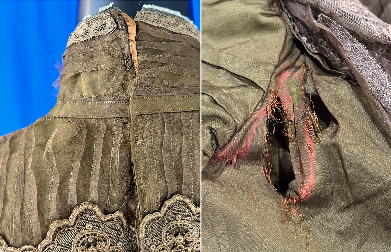 Victorian Brown Silk Button Lace Trim High Neck Collar Bodice Skirt Dress VTG