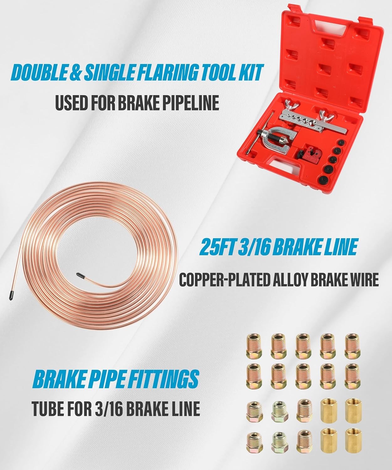 • 25 ft 3/16 Copper Coated Brake Line Kit with 16 Fittings and 4 Unions Gold