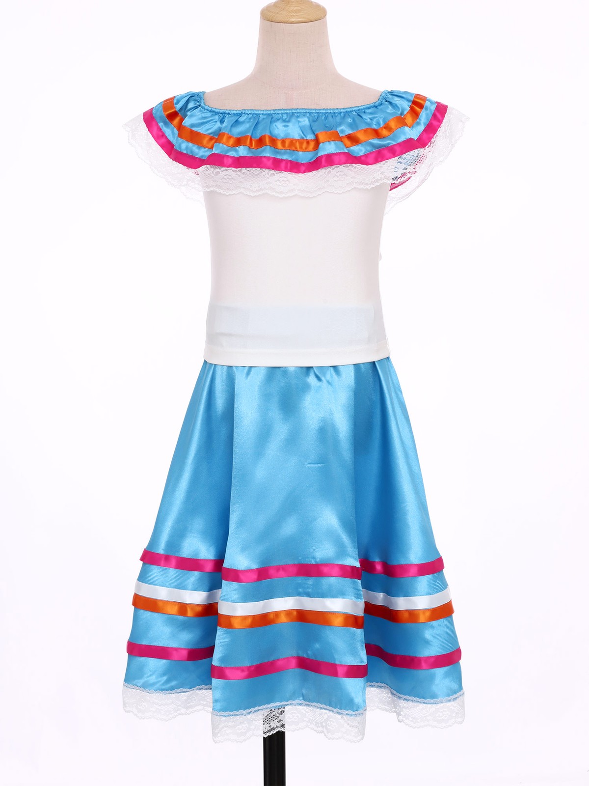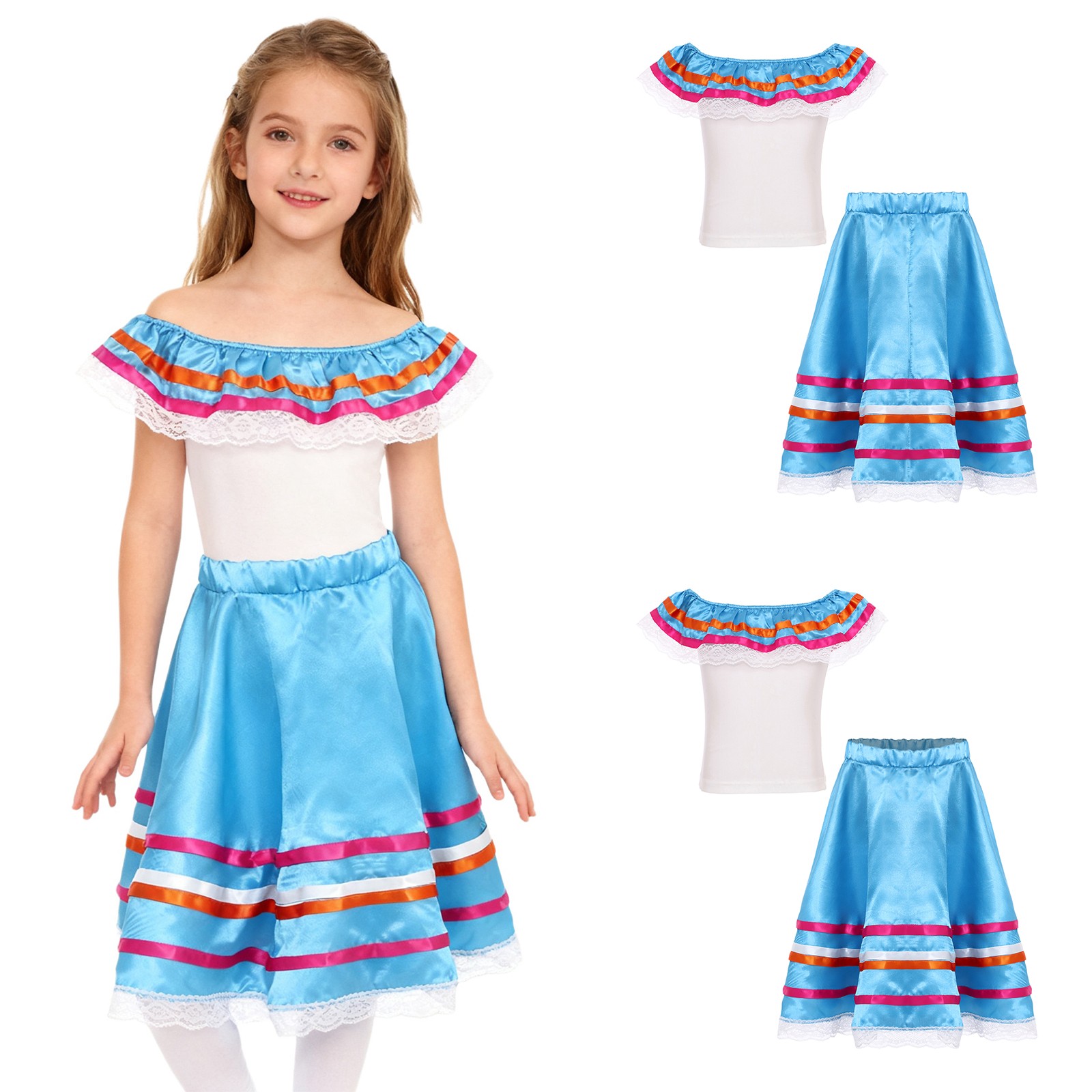 Kids Girls Mexican Dress Retro Ruffled Top With Skirt Colorful 2 Pieces Teens