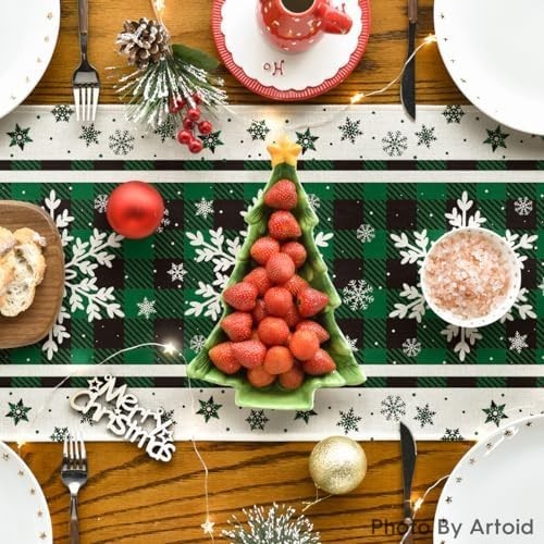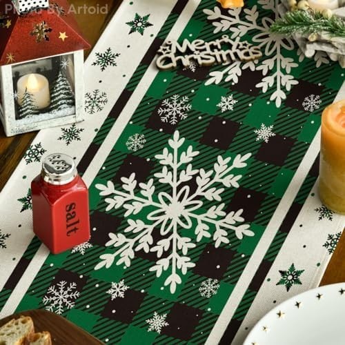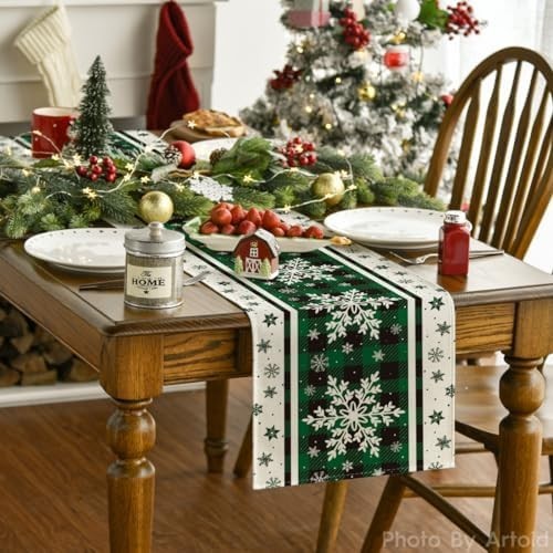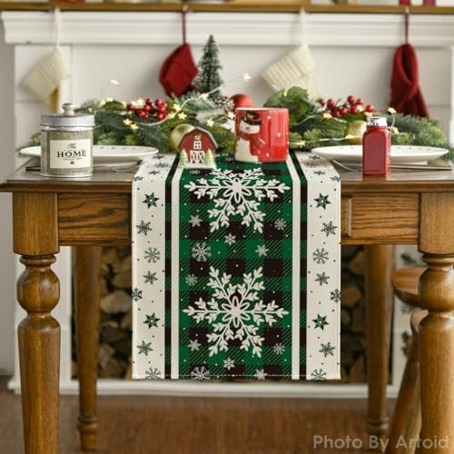 Buffalo Plaid Snowflakes Christmas Table Runner, Seasonal Winter Kitchen Dining