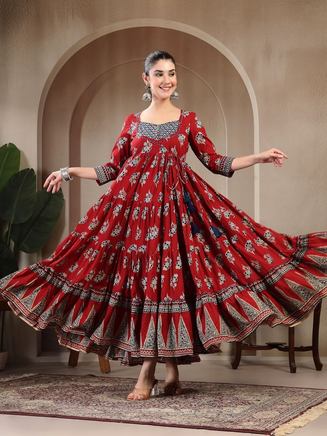 как выглядит Indian Women Cotton Maroon Printed Anarkali Festive Designer Kurta Kurti Dress фото