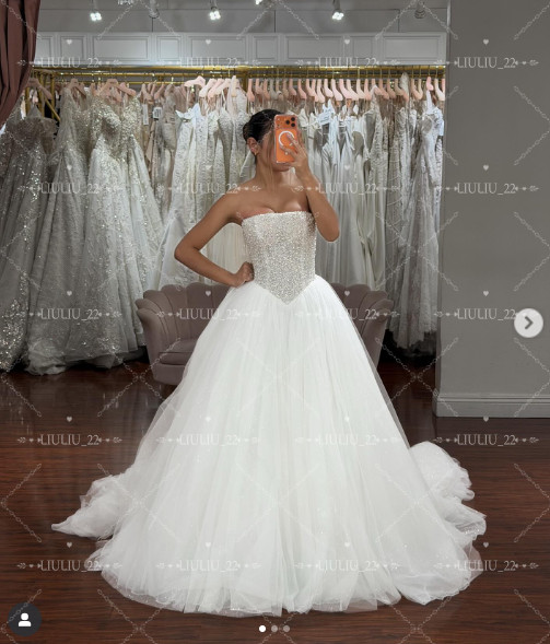как выглядит Strapless Wedding Dresses A-Line Sweep Train Glitter Corset Tulle Bridal Gowns фото