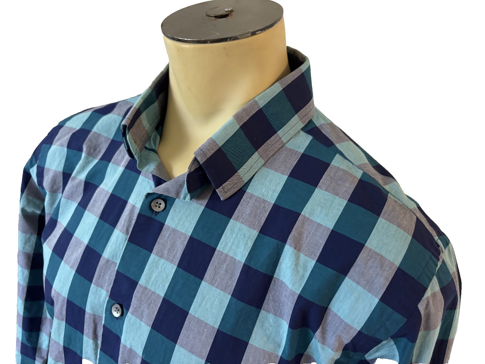 Express Men's Blue Plaid Button Down Modern Fit Long Sleeve Shirt Size L 16-16.5