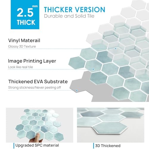 10-Sheet Hexagon Peel and Stick Backsplash for Kitchen, New Upgrade Aqua Blue