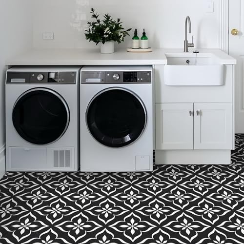 MORCART Peel and Stick Floor Tile 7.87x7.87 Inch 20 White Flowers Black FT-1627