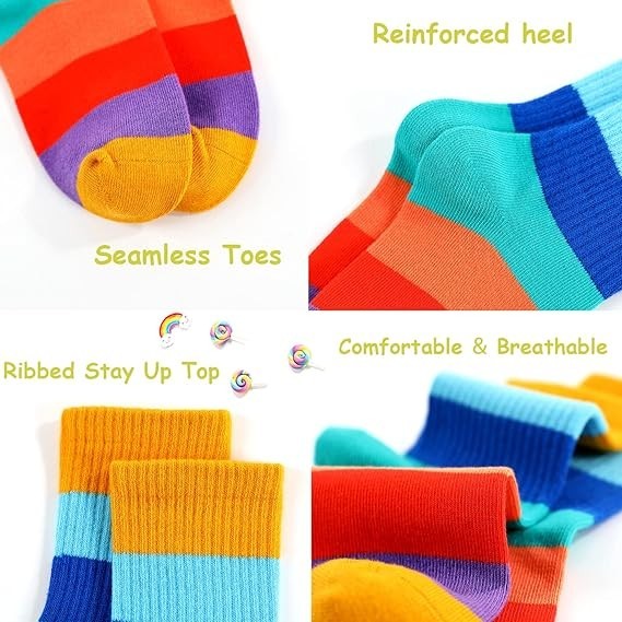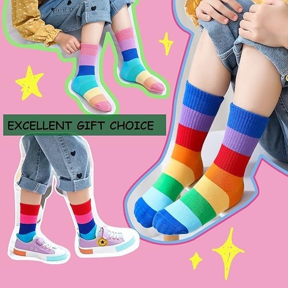5 Pack Girls Seamless Crew Cotton Socks Kids Casual School Rainbow Stripes