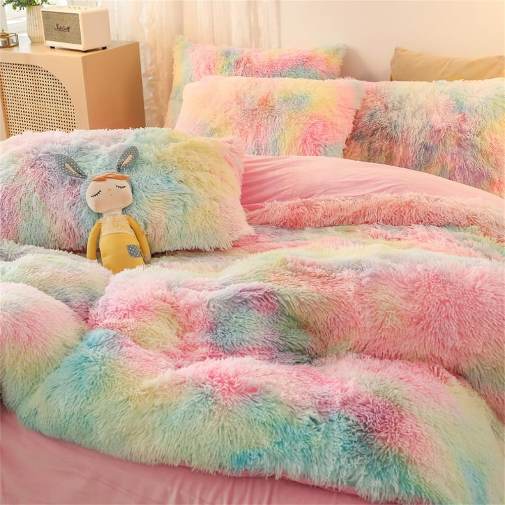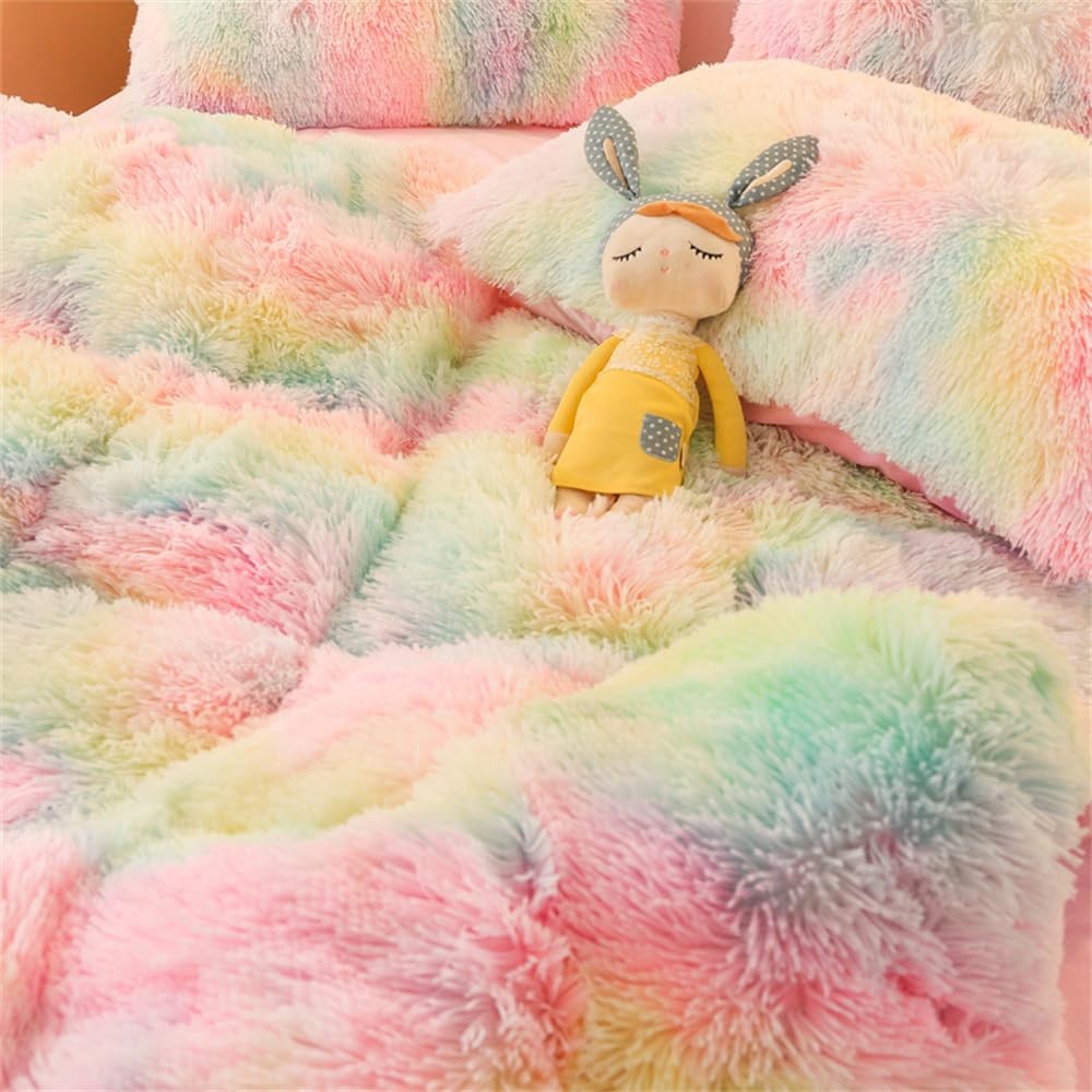 Faux Fur Plush Comforter Set Full Size - Rainbow Fluffy Fuzzy Shaggy Bedding ...