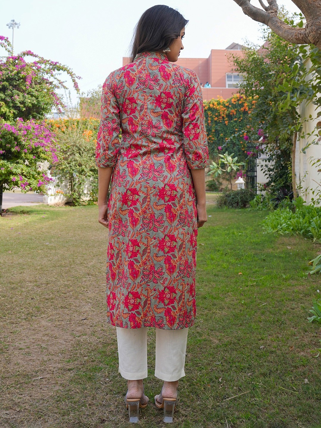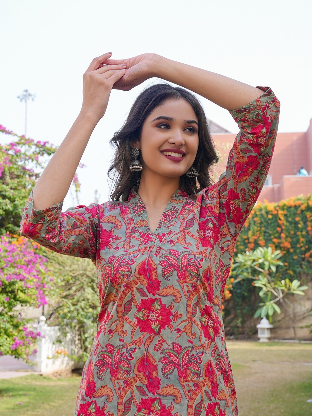 Indian Women Gray Pink Cotton Floral Printed Kurta Kurti Top Tunic New Dress