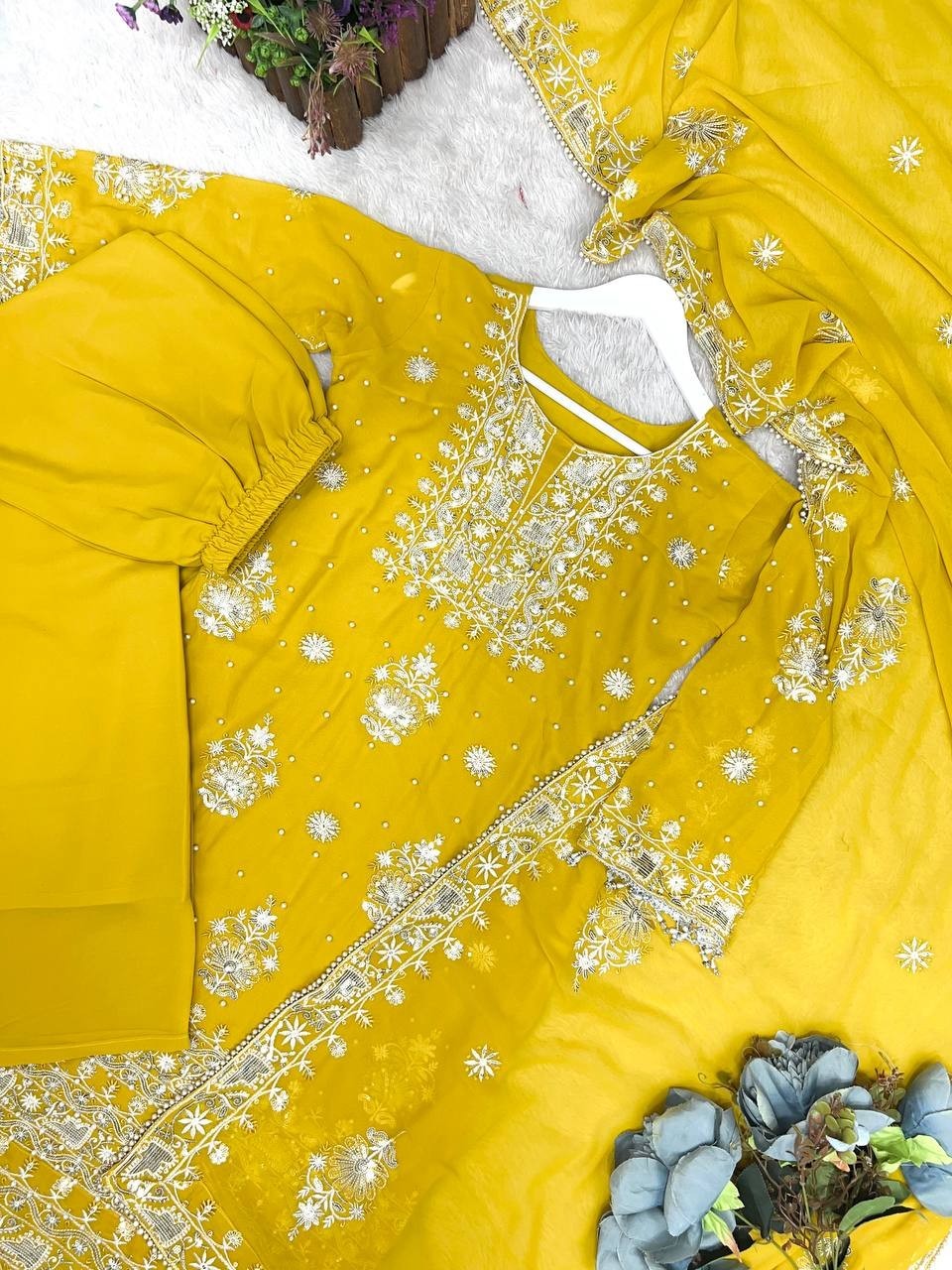 как выглядит Launching New Yellow Faux Georgette Kurta Palazzo With Dupatta For Women фото