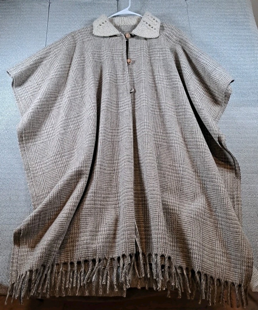 как выглядит Vtg Long Wool Tan Plaid Fringed Cape Poncho With Crochet Collar Western Classic фото