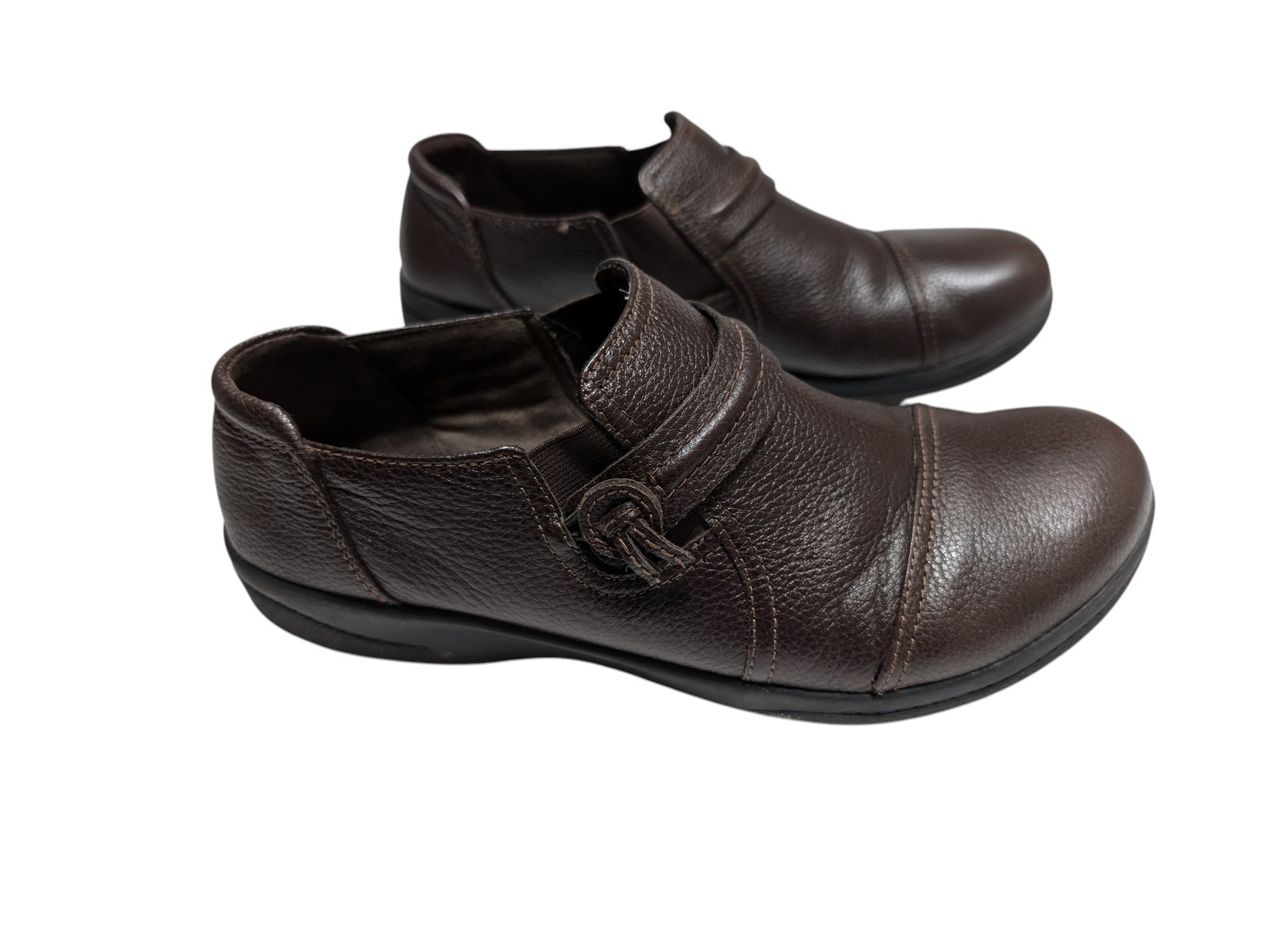 Clarks Women Cheyn Madi Dark Brown Tumbled Leather Slip On Loafers. Size 8