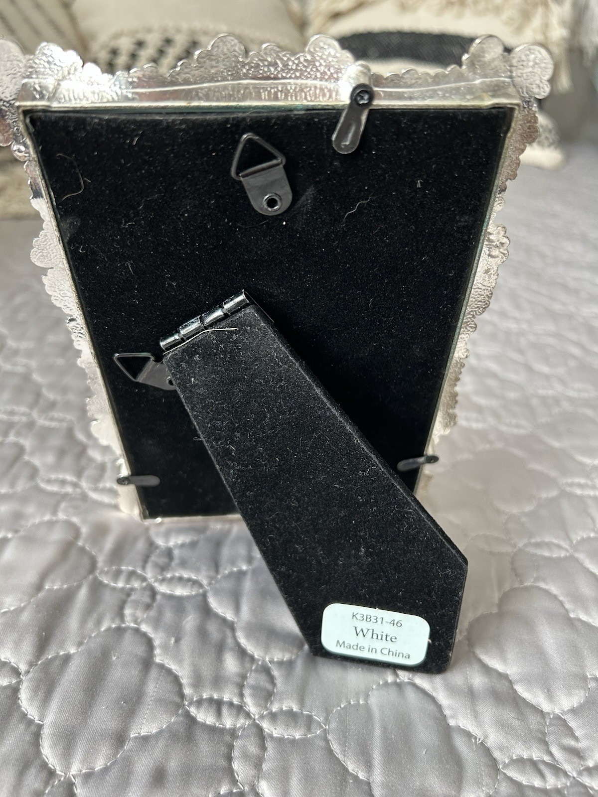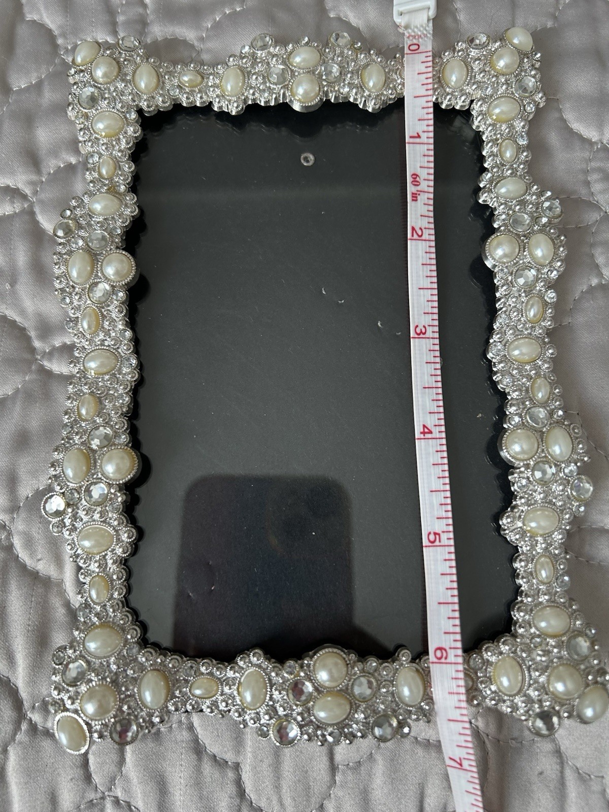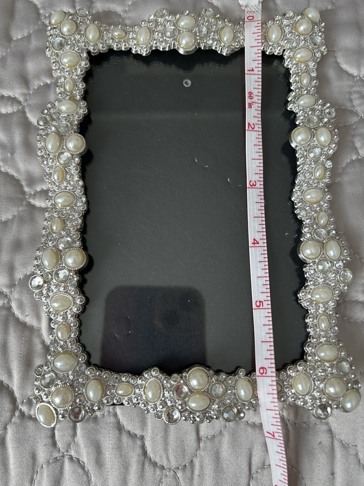 Silver Tone picture frame embellished with faux pearls and rhinestones.