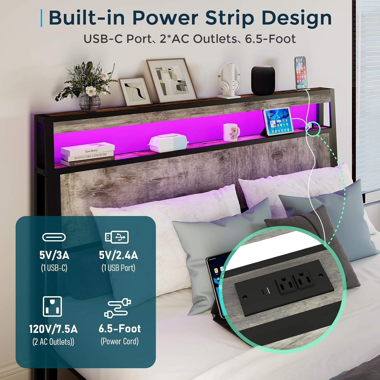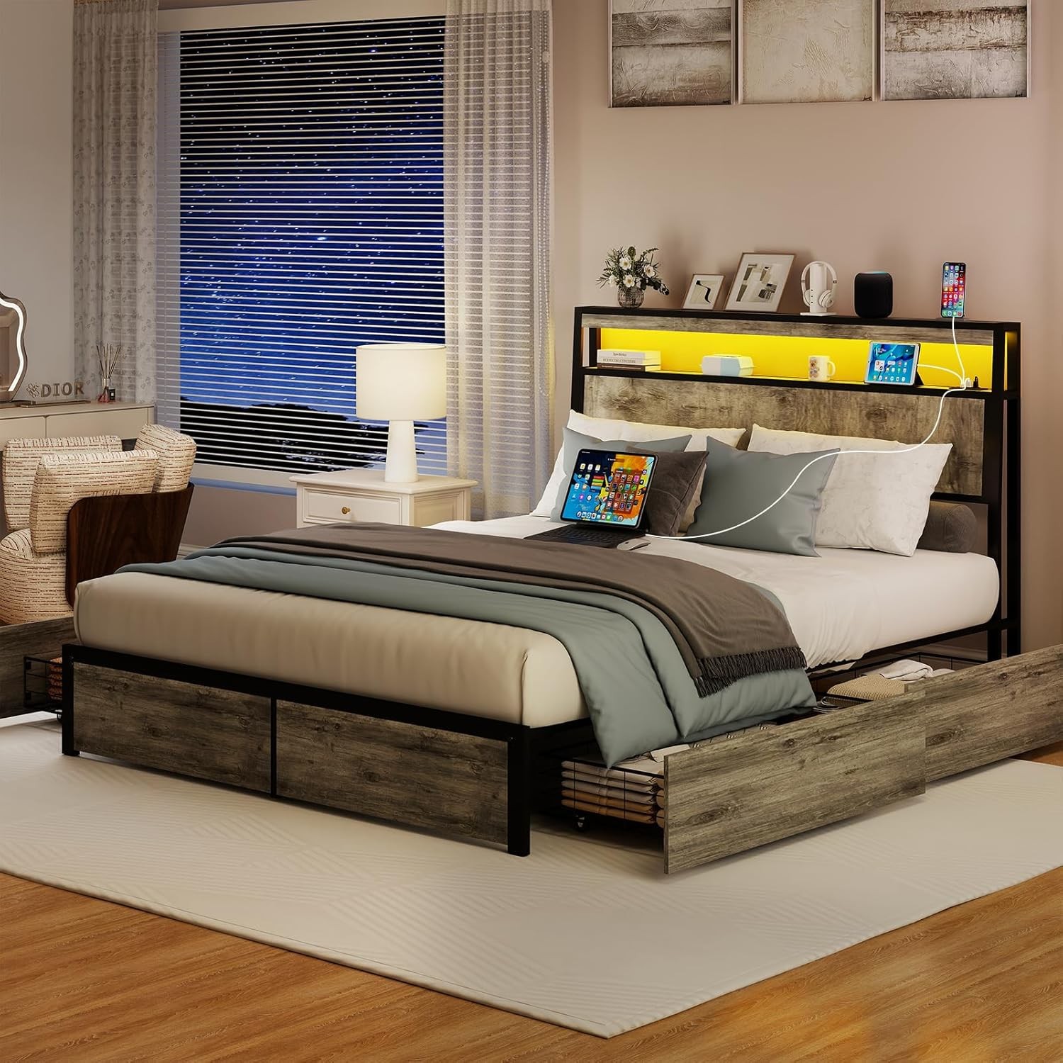 как выглядит Full/Queen/King Bed Frame with 2-Tier Storage Headboard with Charging Station фото