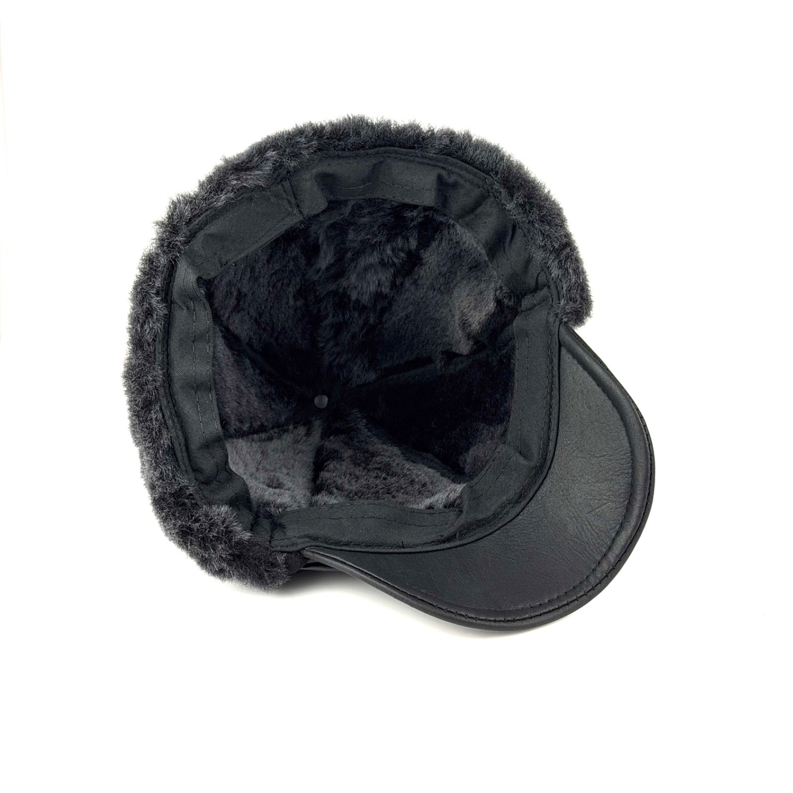 Handmade Real Shearling Leather Trapper Hat Black Sheepskin Hat for men