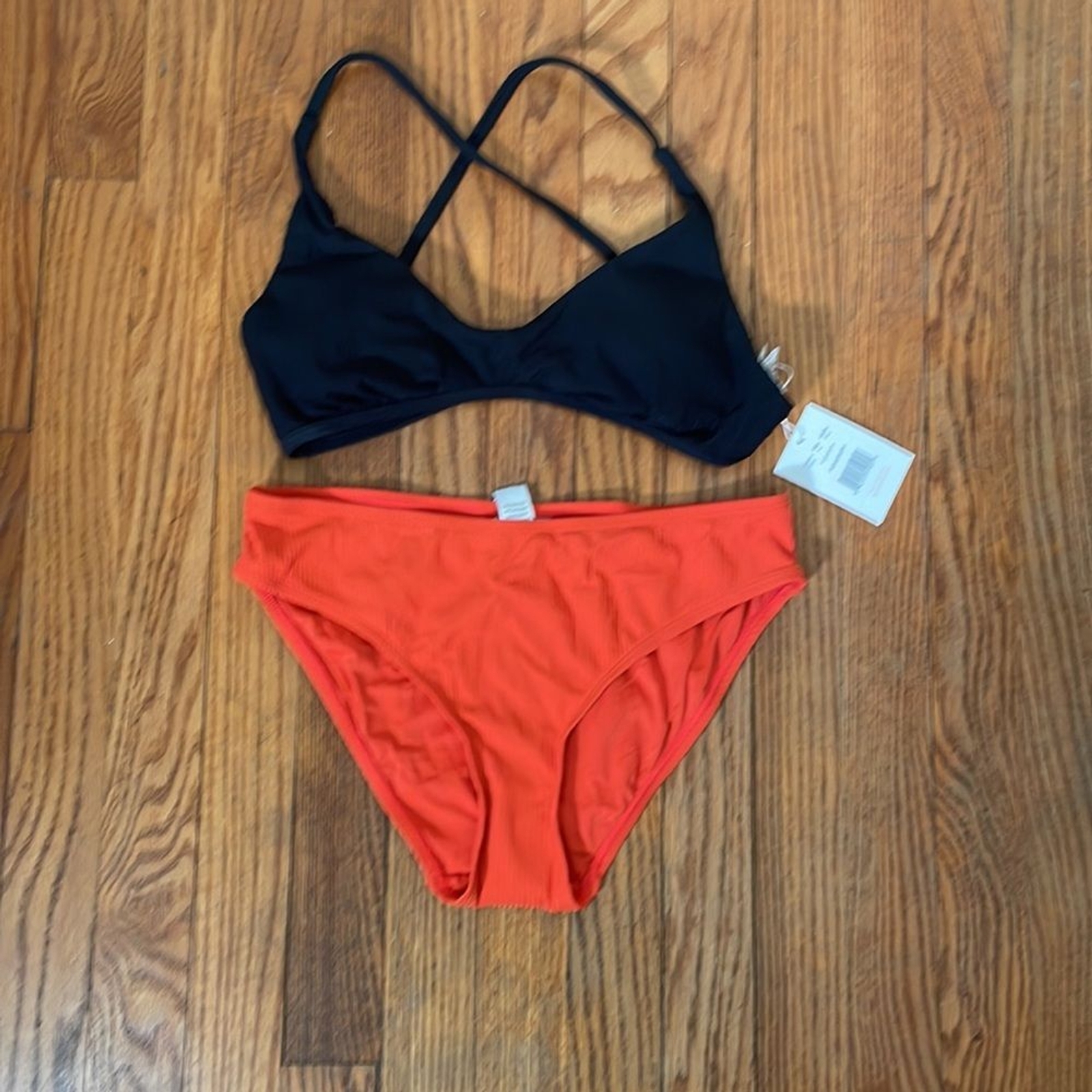 как выглядит Andie Bikini Set Valencia Top Bikini Bottom Ribbed Black Orange size M NWT фото