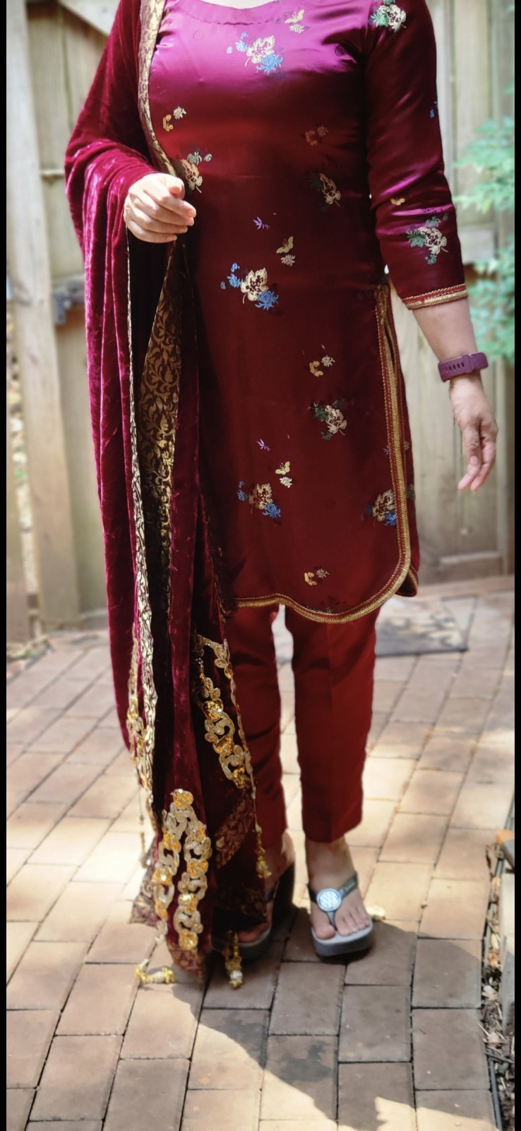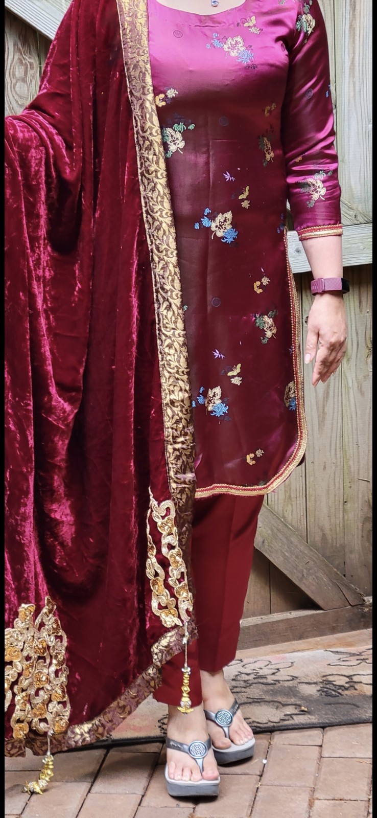 как выглядит Pure silk Maroon Floral Shalwar Kameez Pakistani Wear 3 Piece With Velvet Shawl фото