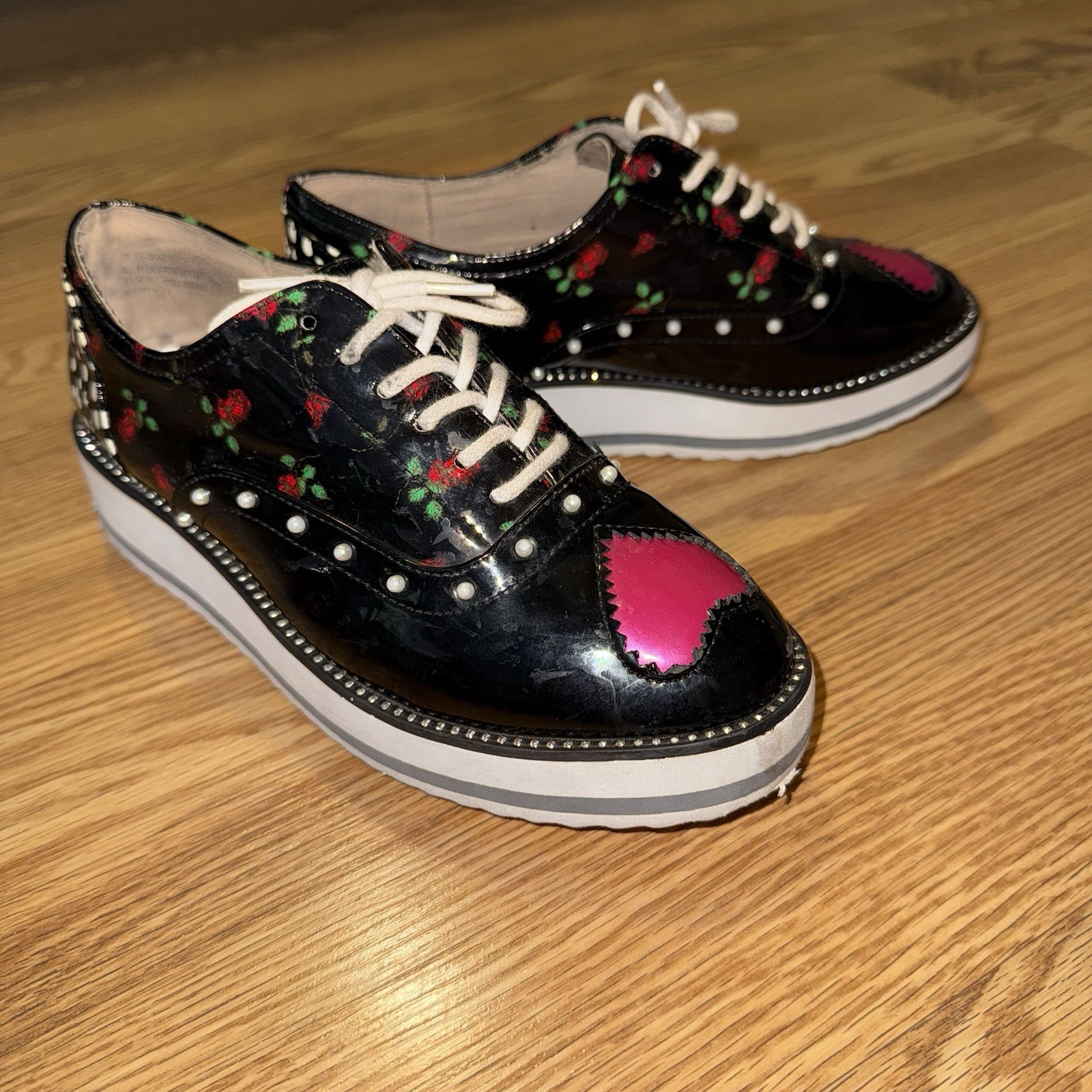 как выглядит Betsey Johnson Marti Loafer Black Patent Lace Ups with Pink Hearts Pearls size 2 фото