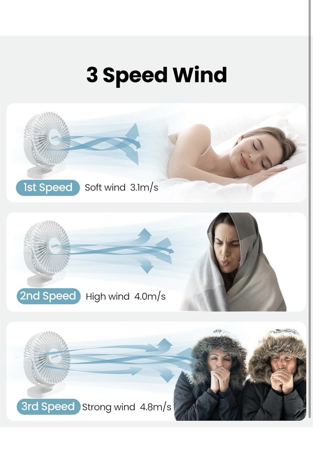 Special Feature: Powerful wind, Plug in usb fan, 3 speeds, 30 Degrees adjustable,