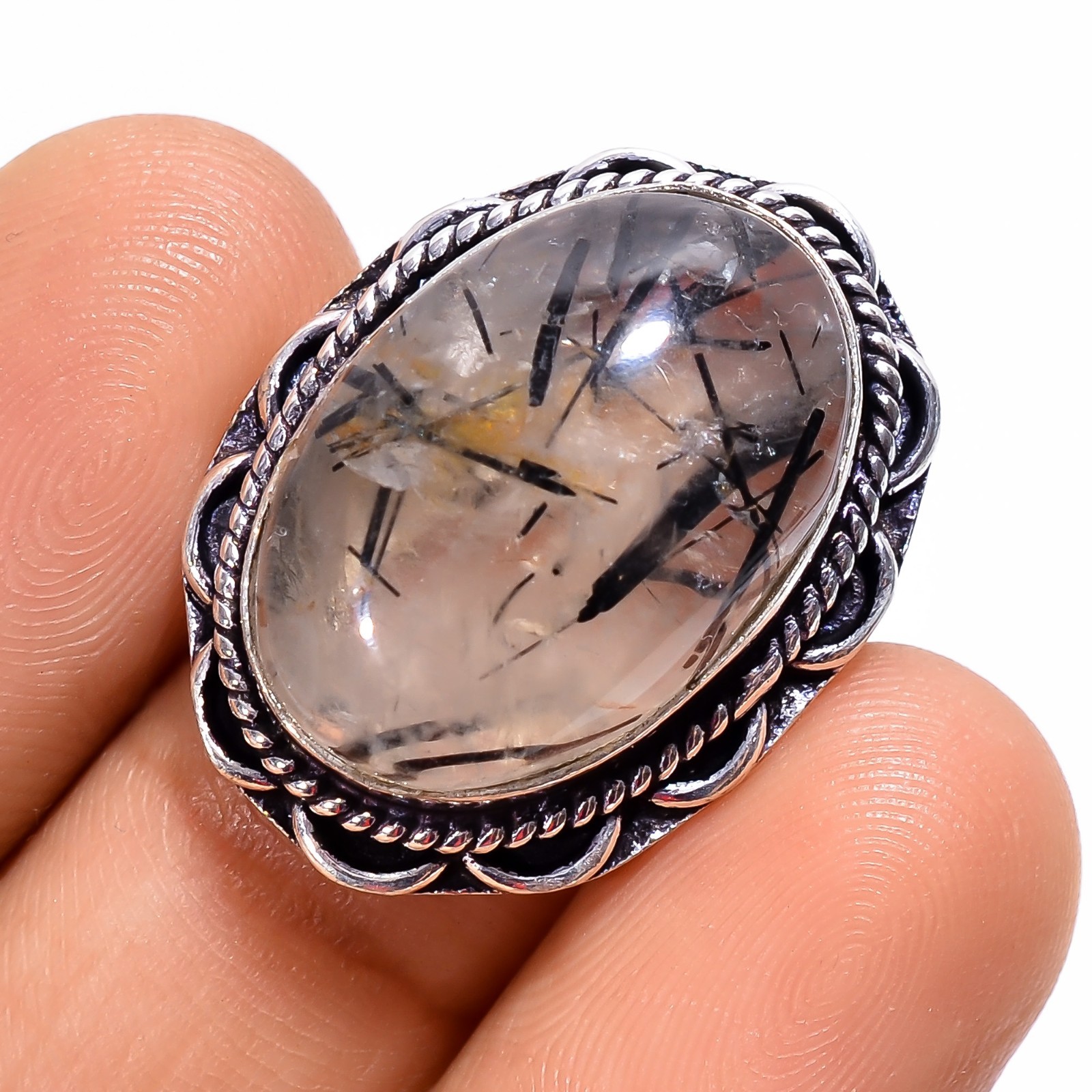 как выглядит Natural Black Rutile Quartz Gemstone 925 Sterling Silver Handmade Ring 5.5 US фото