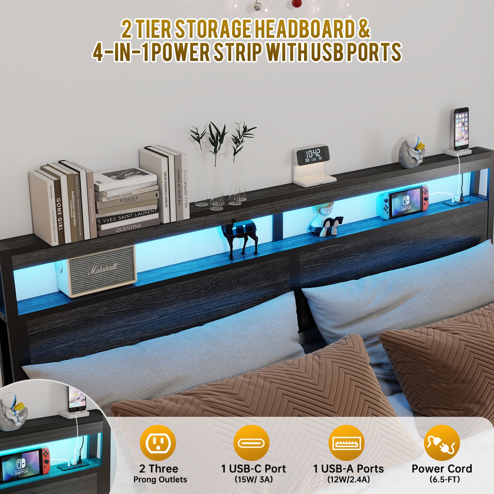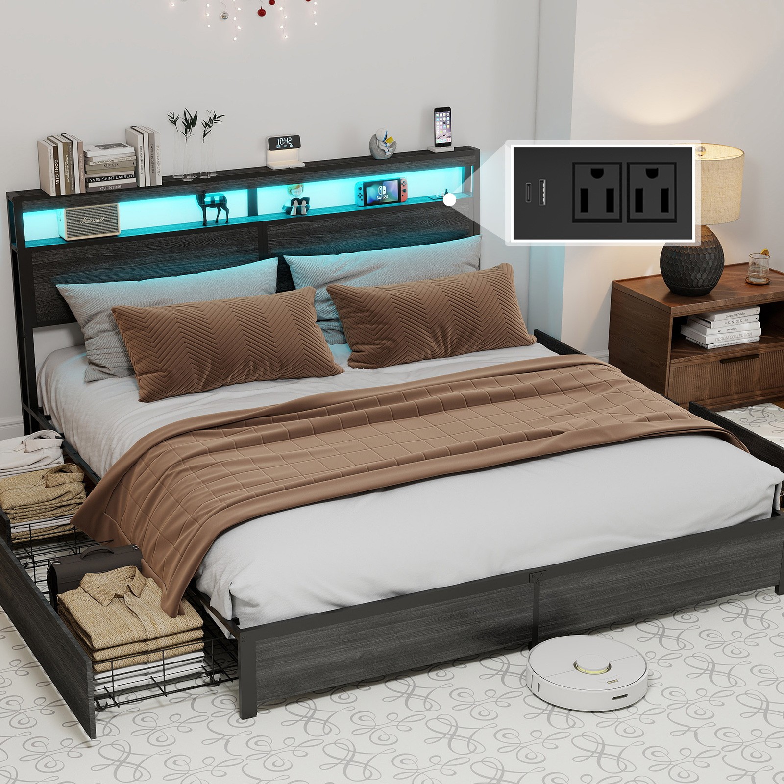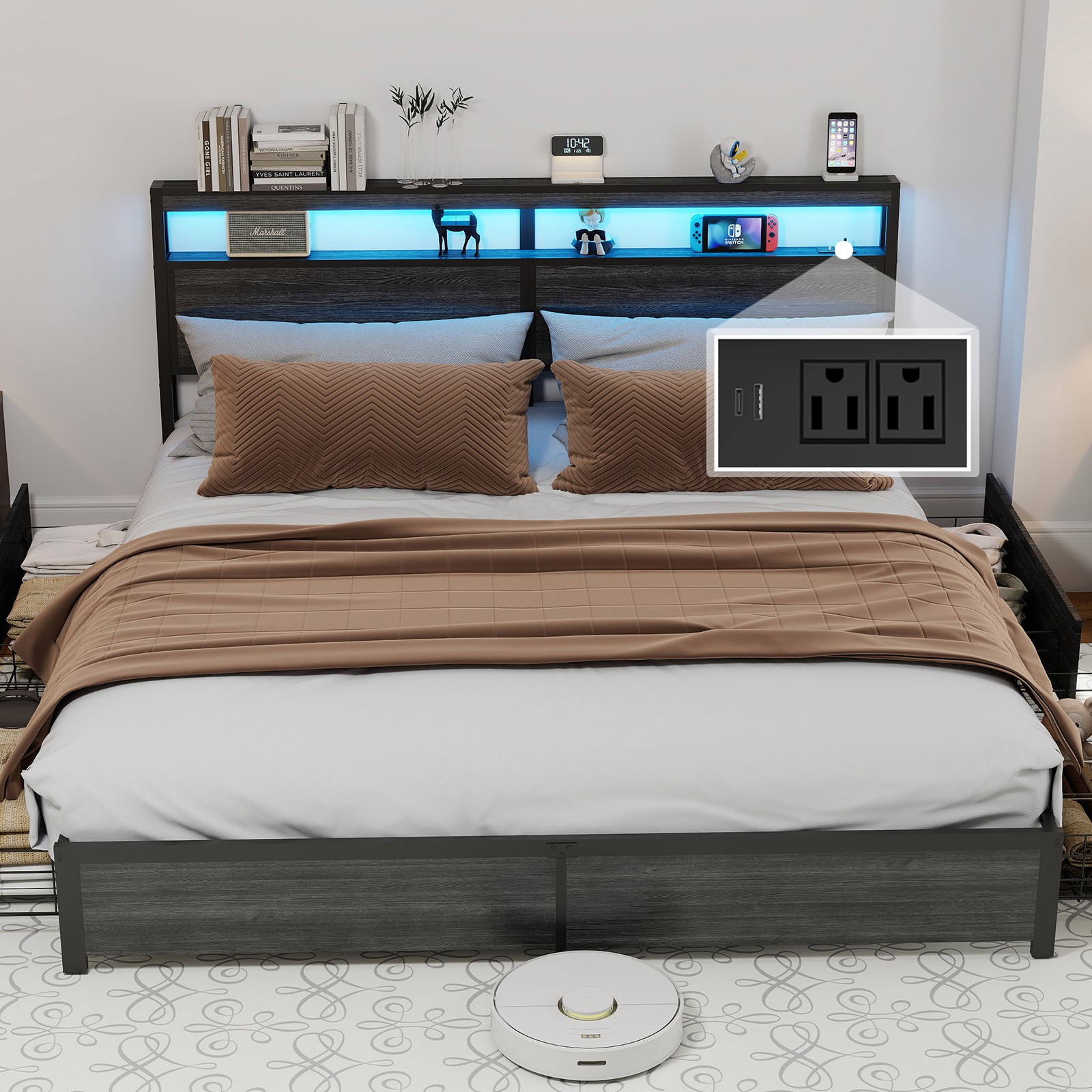 Full Queen Bed Frame with 4 Storage Drawers and Charging Station LED Lights QF