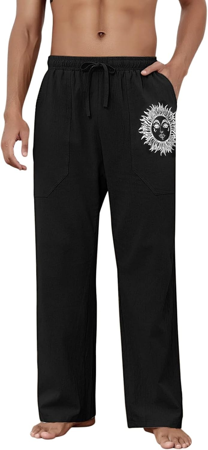 Mens Cotton Linen Pants Summer Beach Loose Fit with Elastic Waist Drawstring