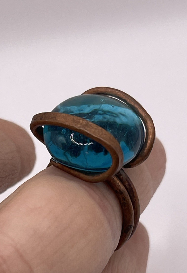 Handmade COPPER Wire Wrapped RING with Glass BLUE Stone Size: 6.5