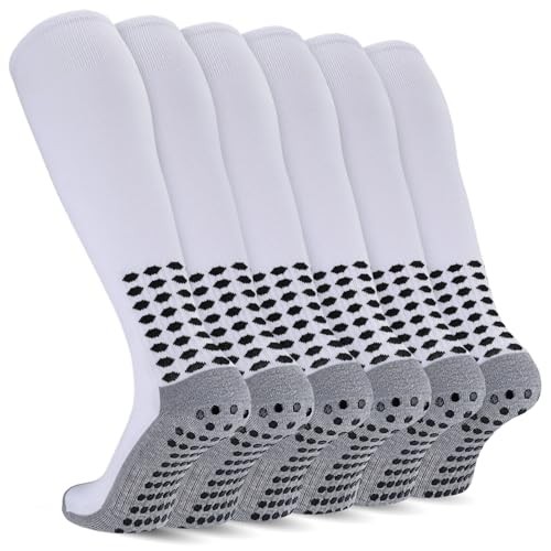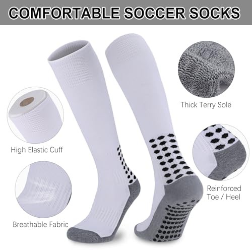 3 Pairs Kids Youth Grip Soccer Socks, Non Slip Knee High Soccer Medium White
