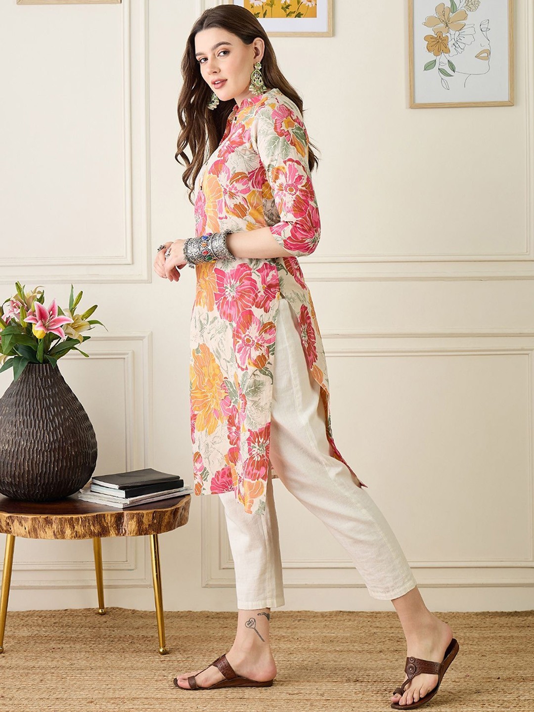 как выглядит Indian Women Beige Multi-Color Floral Cotton Printed Kurta Kurti New Top Tunic фото