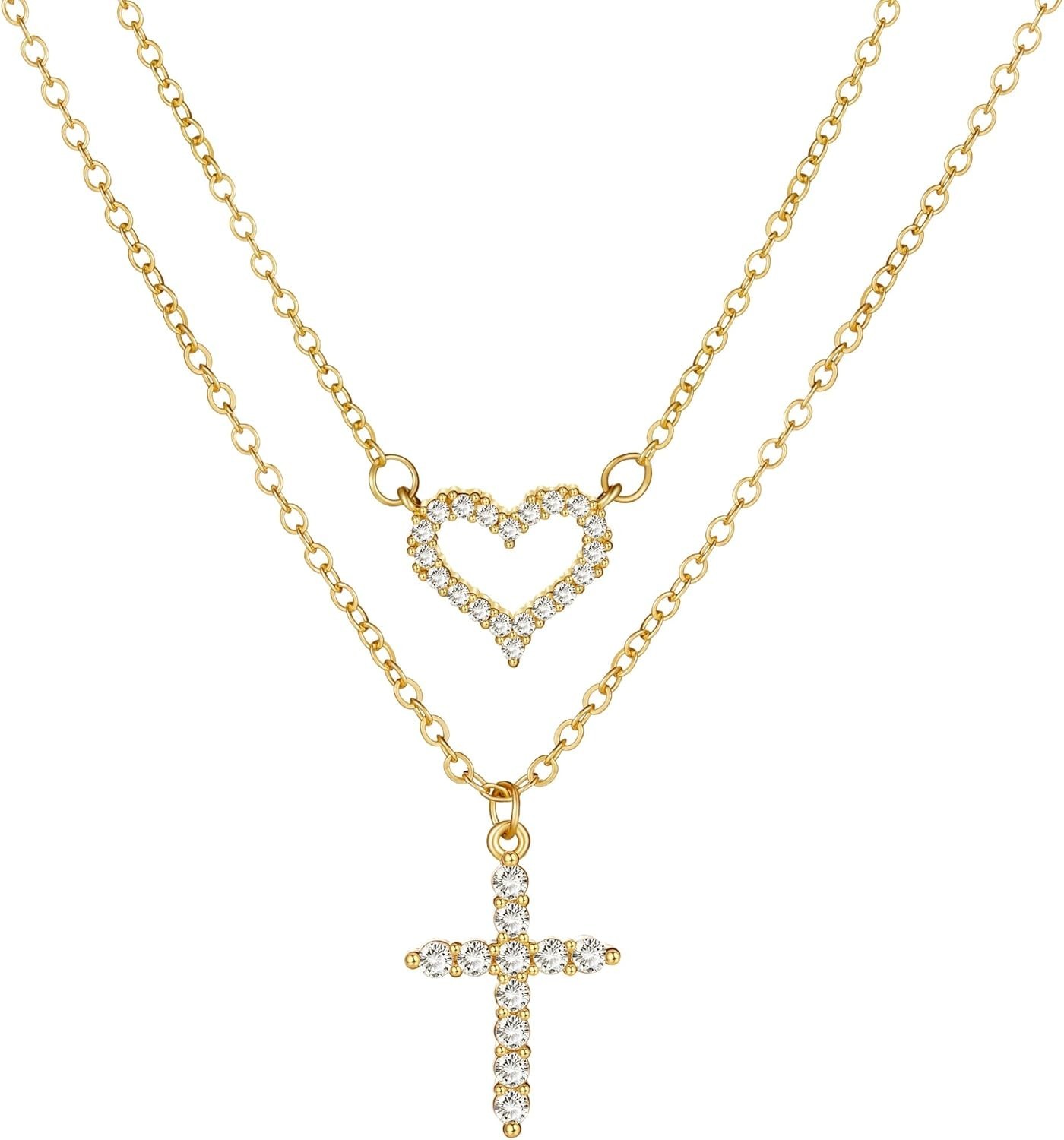 14K Gold Plated Layered Necklace for Women, Pearl Cross Cubic Zirconia Heart ...