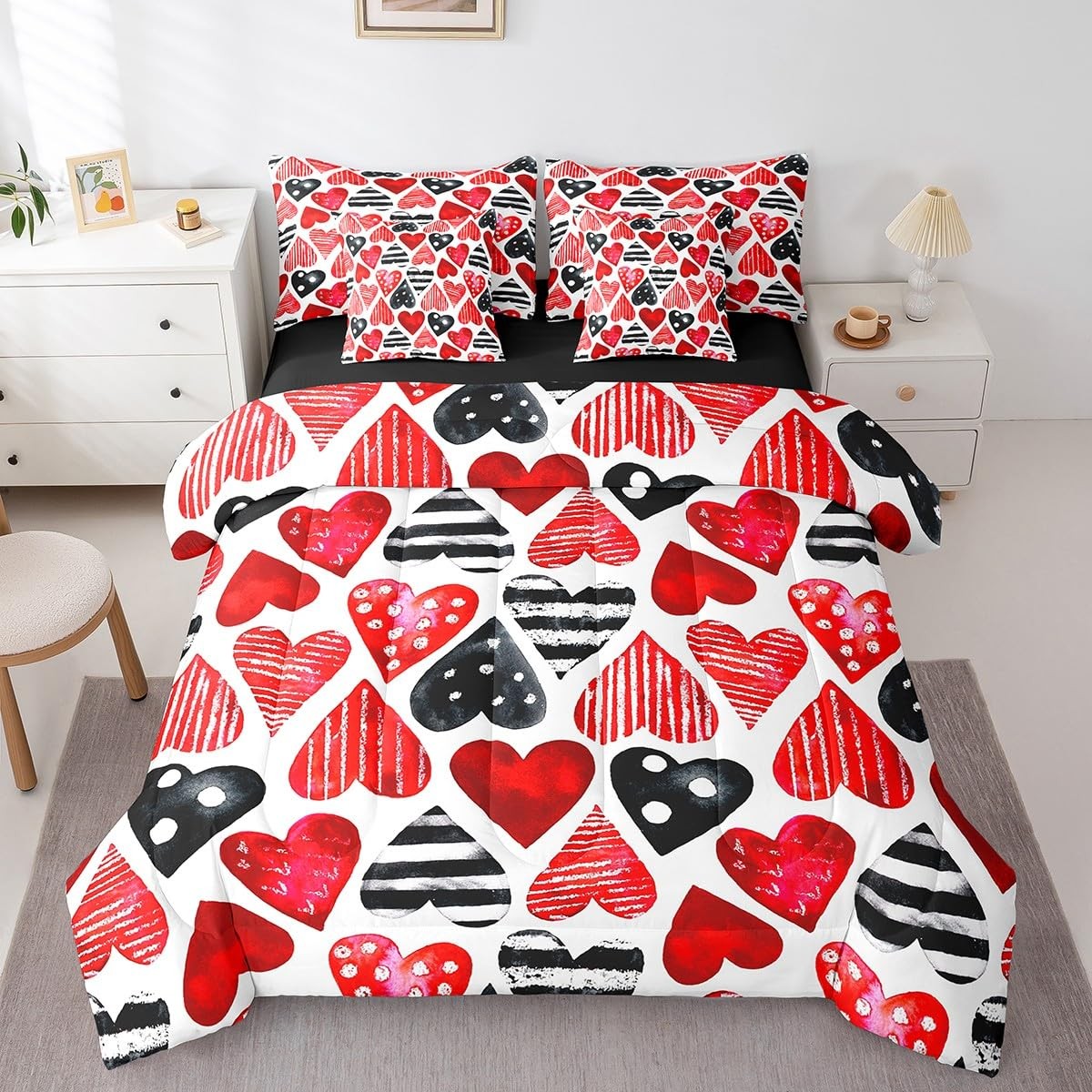 Valentine's Day 7 Piece Bedding Set Full Size Red Black Heart-Shaped Comforte...