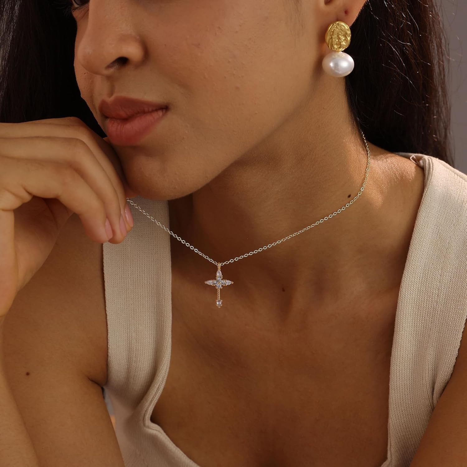 как выглядит Cross Necklace for Women, 14k Gold Plated Dainty Necklace Cute Cubic Zirconia... фото
