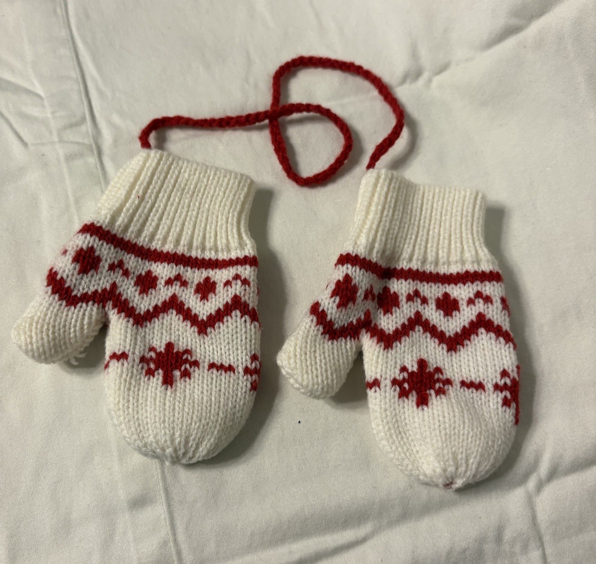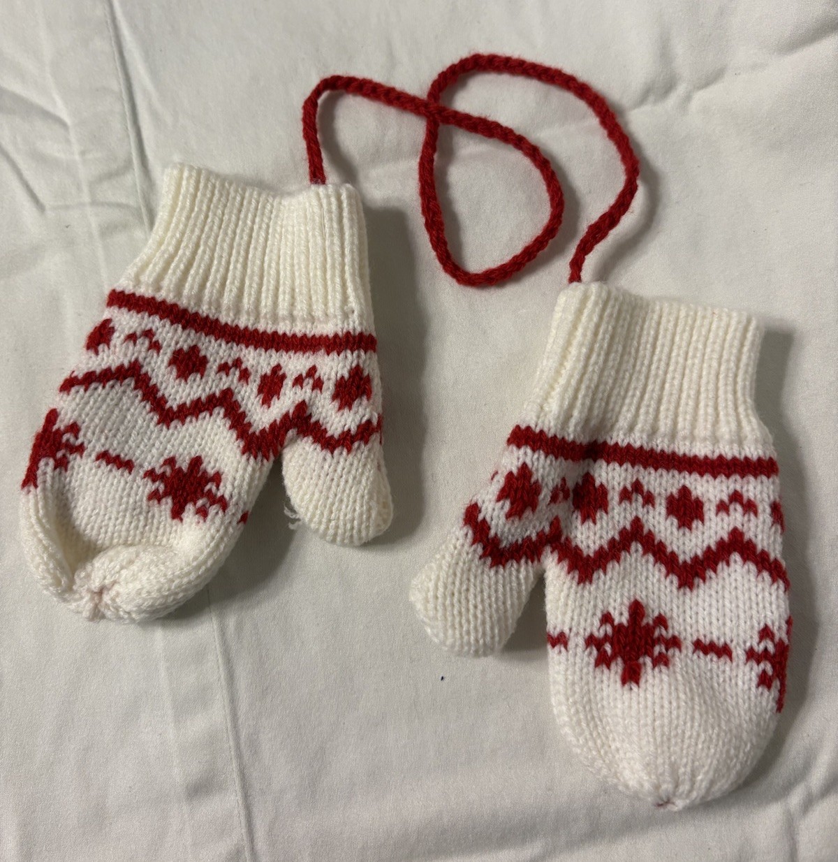 TODDLER CHILD MITTENS WITH STRING White Red SNOWFLAKE Design
