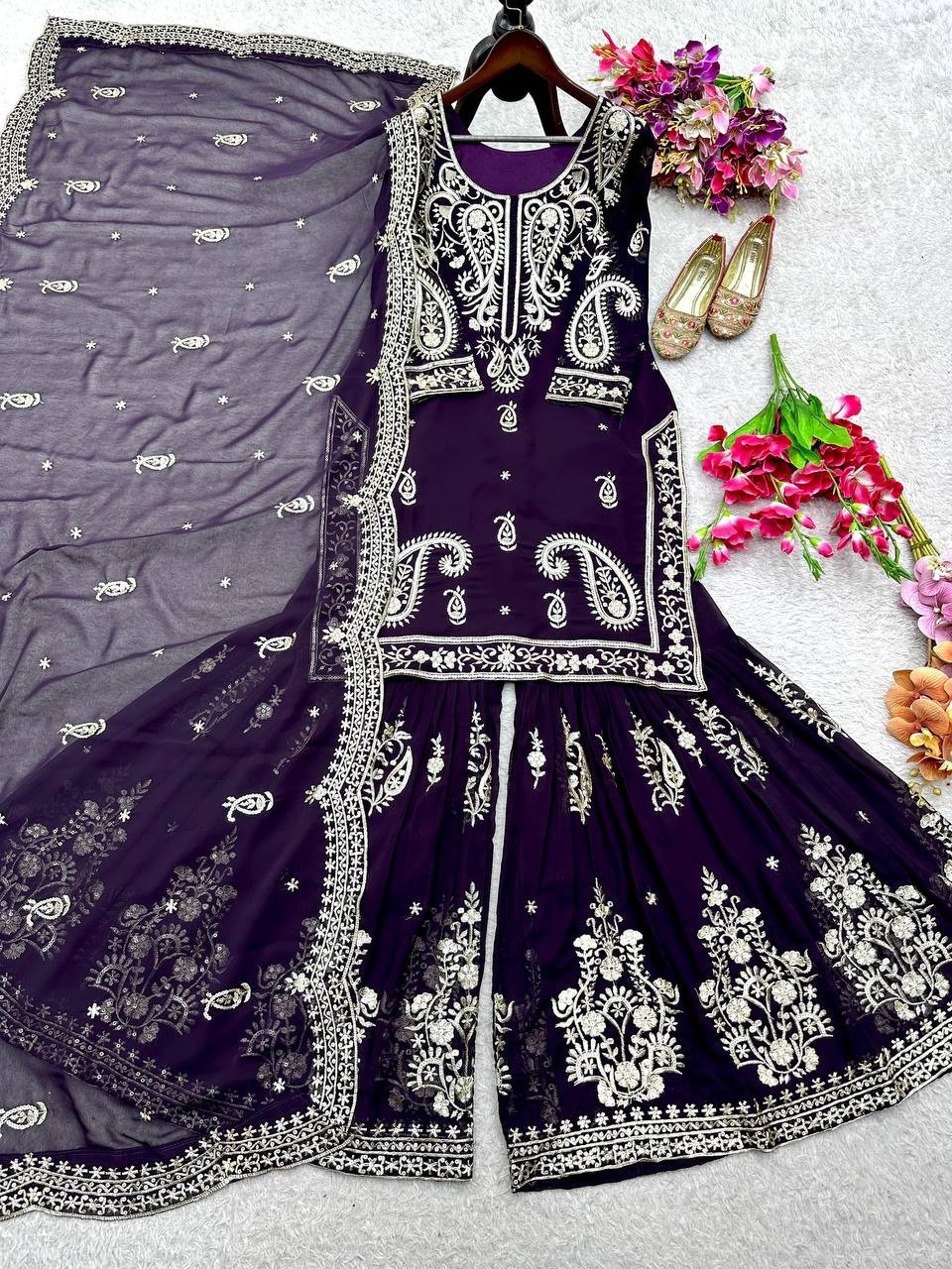 как выглядит New Designer Purple Faux Georgette Kurta Palazzo With Dupatta For Women фото