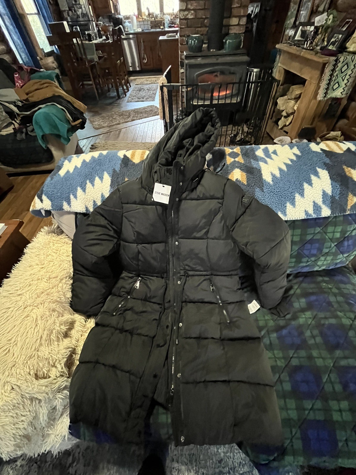 Steve Madden Womens Winter Coat - Insulated Long Hooded Quilted Large Black