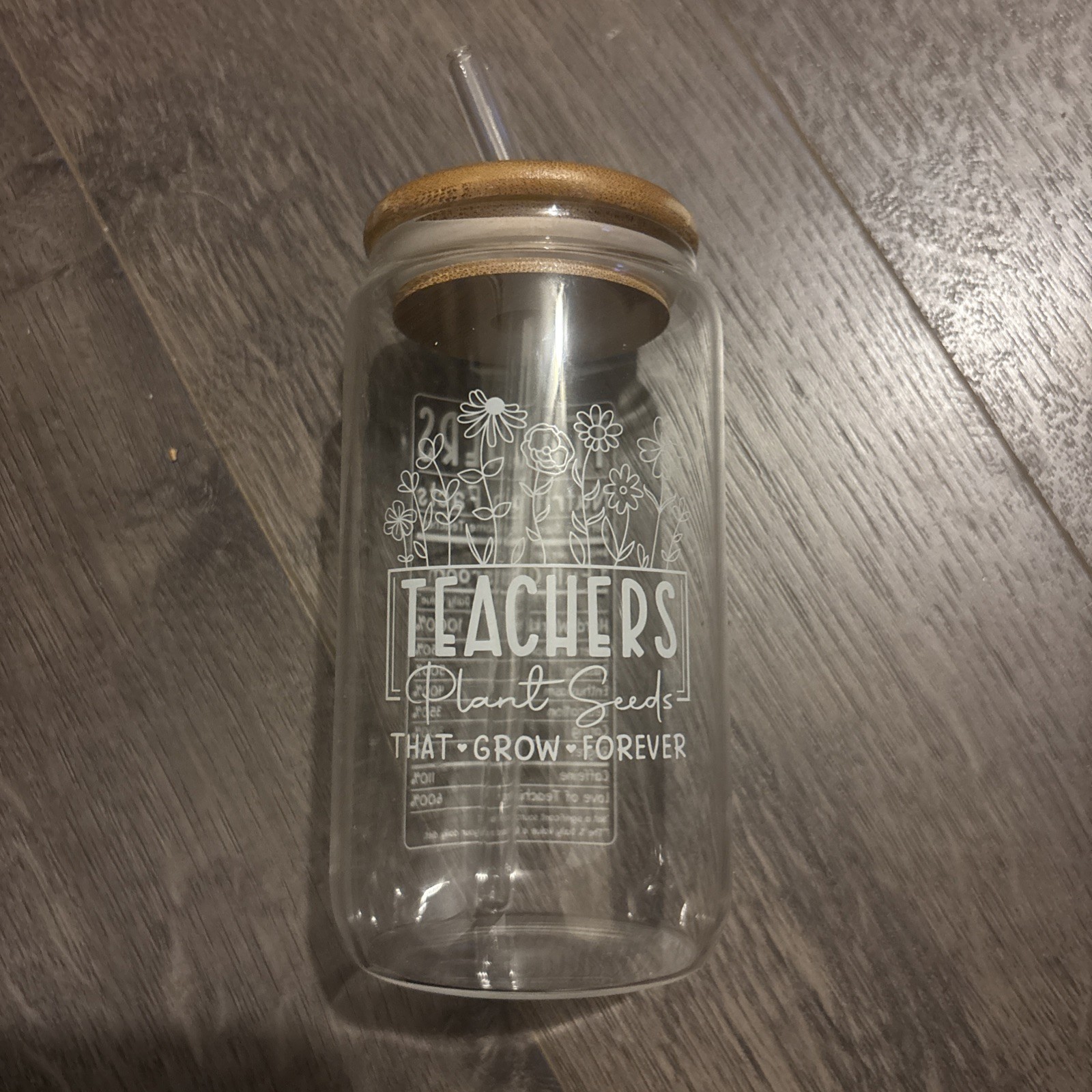 2 cups-Teacher Appreciation Glass Cup with Lid Straws. Best teacher coffee cup