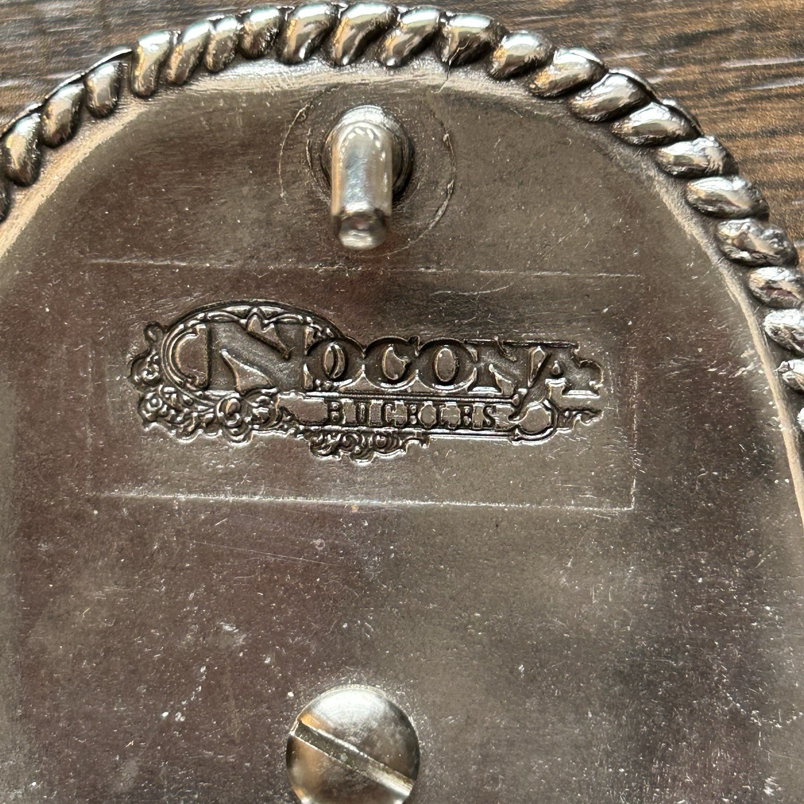 Nocona Western Belt Buckle Silver Toned Floral Scroll Engraved Rope Edge