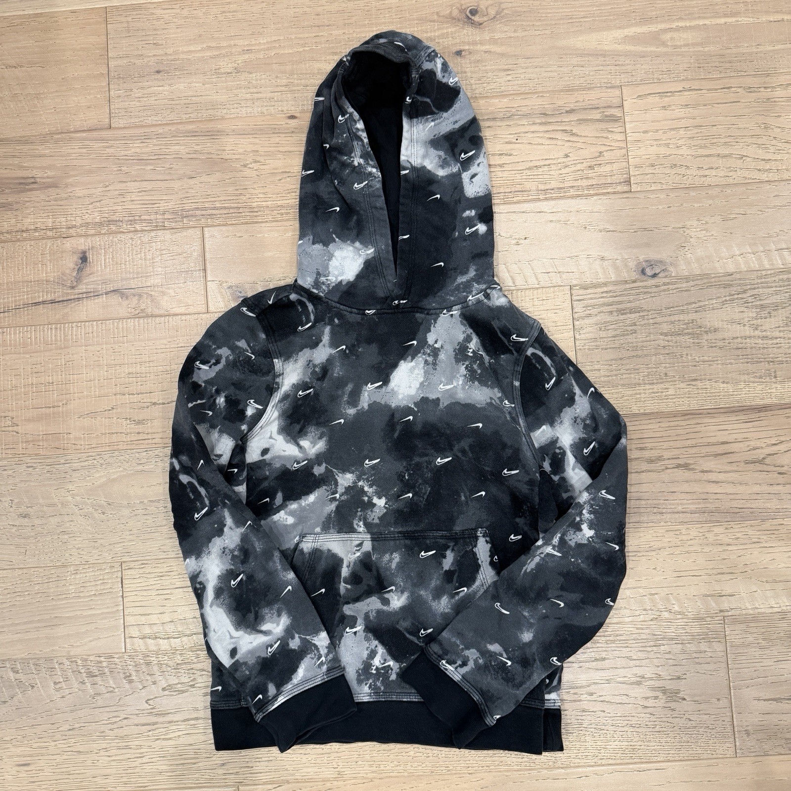 как выглядит Nike Youth Medium Hoodie Joggers Set Black Grey Tie-Dye All Over Swoosh Fleece фото
