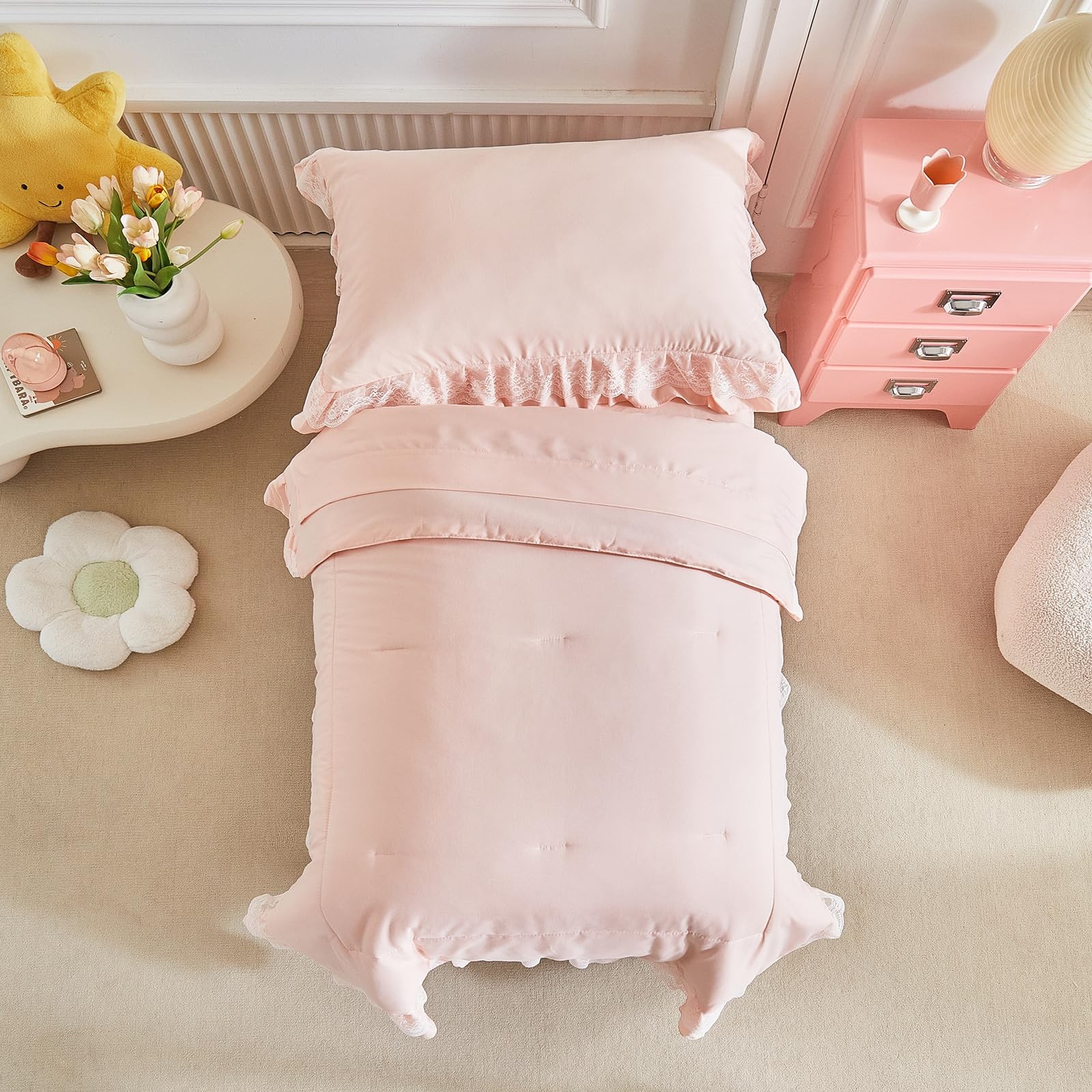 Ruffled Lace Toddler Bedding Set with Ruffle Fringe, Solid Color 4 Pieces Tod...