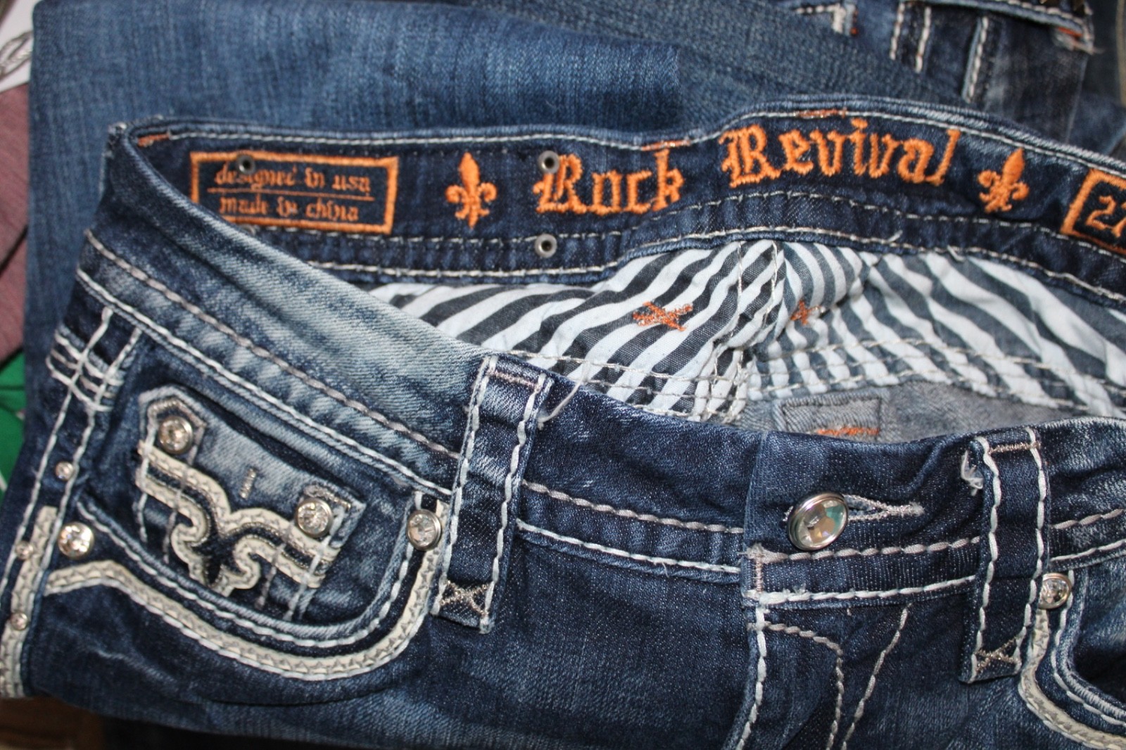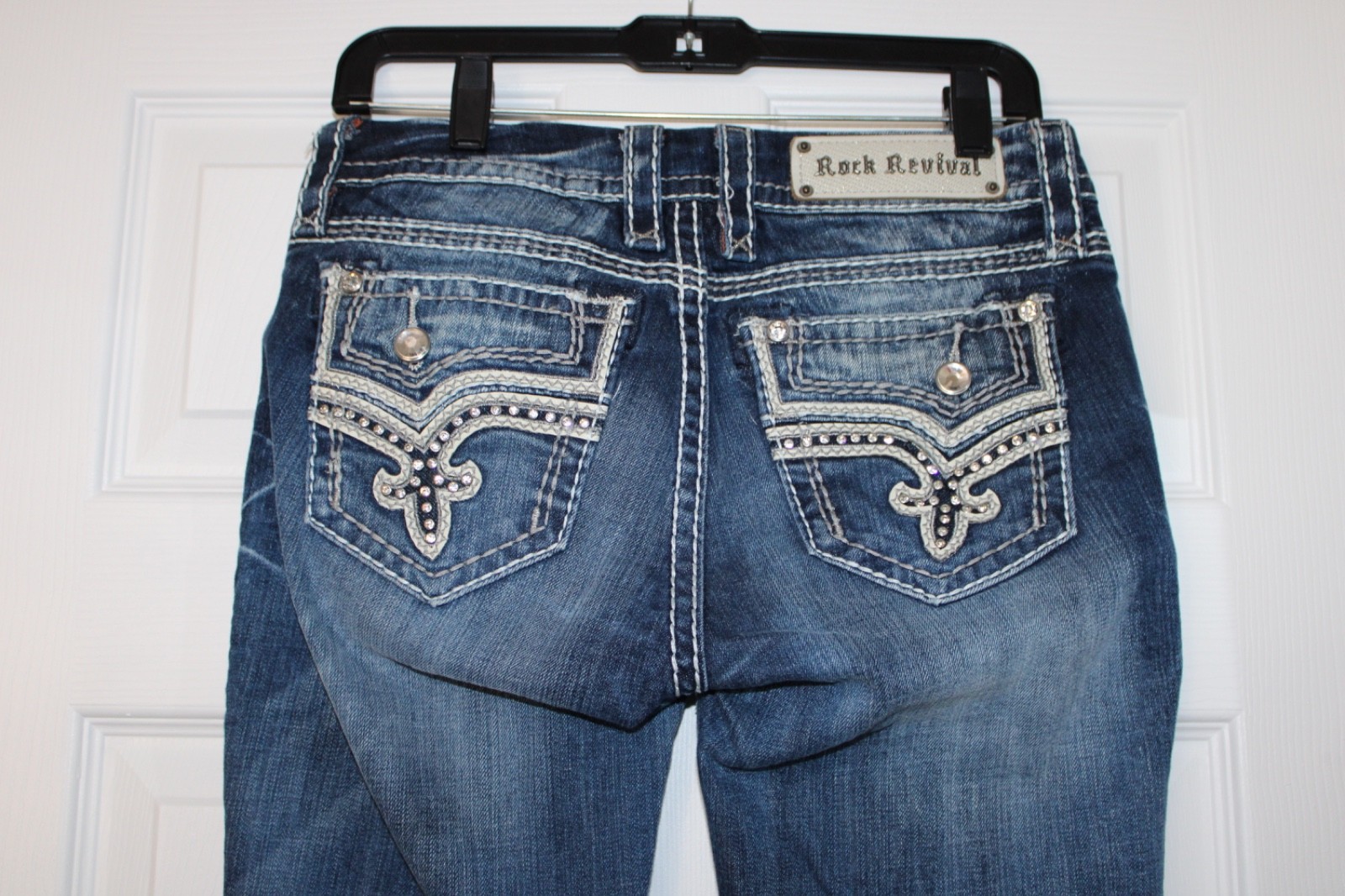 как выглядит ROCK REVIVAL "BETTY " MID RISE BOOT CUT DISTRESSED EMBROIDERED JEANS SIZE 27 x33 фото